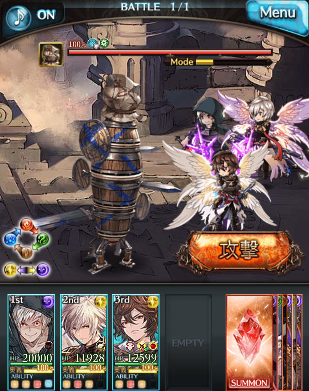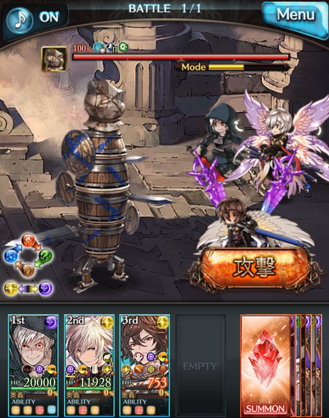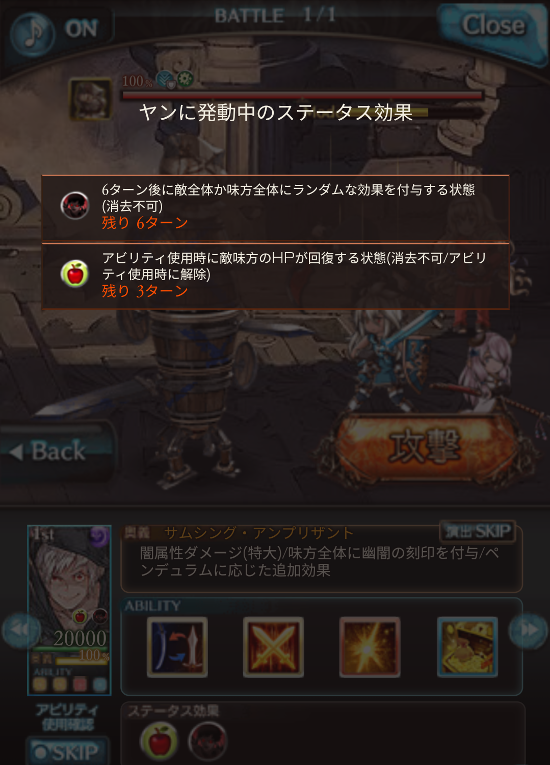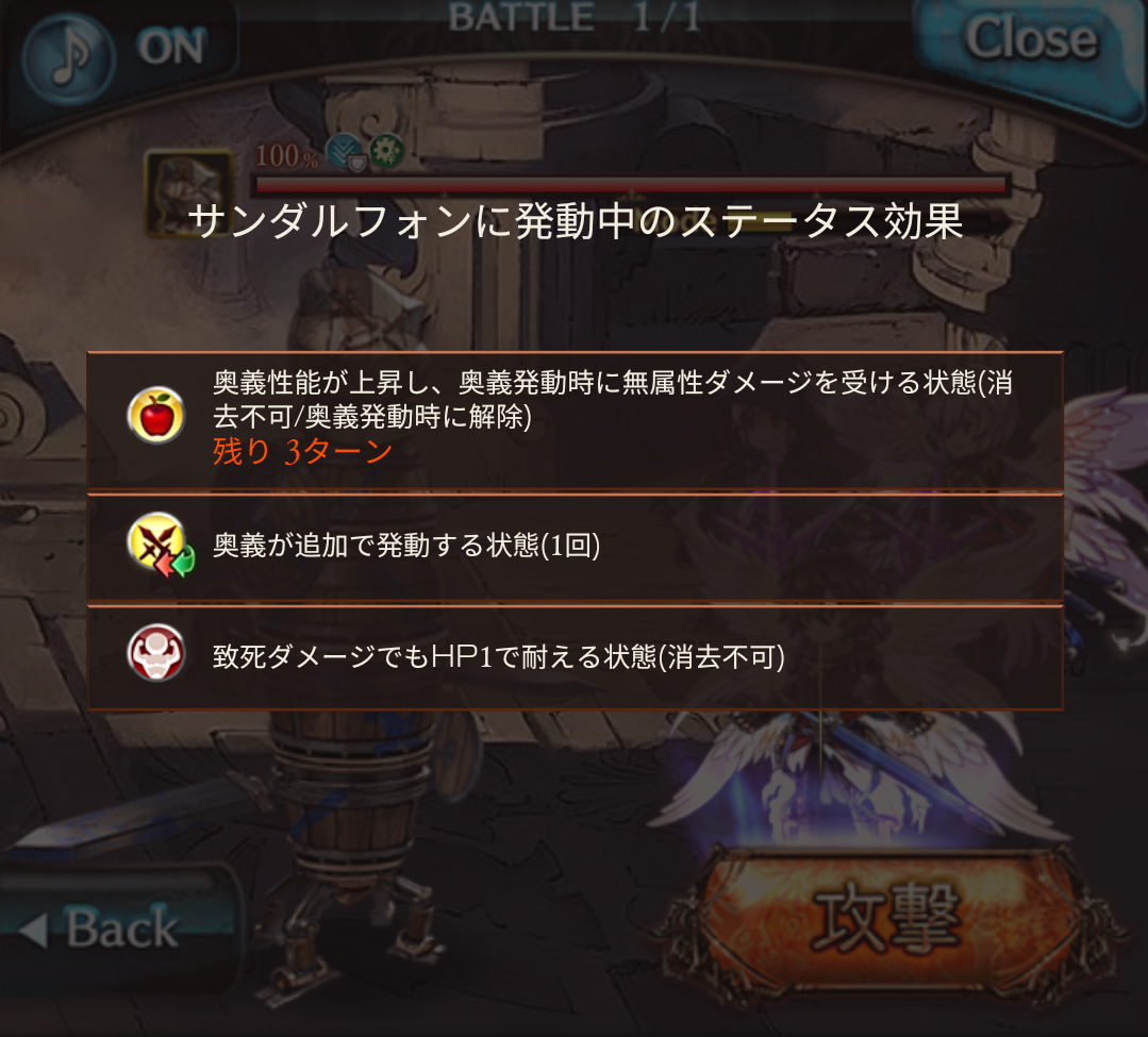 평소 같았으면 초록 사과를 모두에게 나눠줬을 텐데, 산달폰 데려가면 6턴 경과 후 노란 배경의 사과와 함께 버프와 오의가 추가로 한 번 더 발동하는 버프를 산달폰에게만 준다