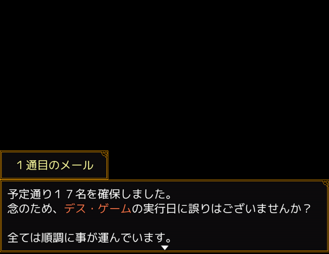 "예정대로 17명을 확보했습니다. 만일을 위해, 데스 게임의 실행일에 착오는 없습니까? 모든 일은 순조롭게 진행되고 있습니다."