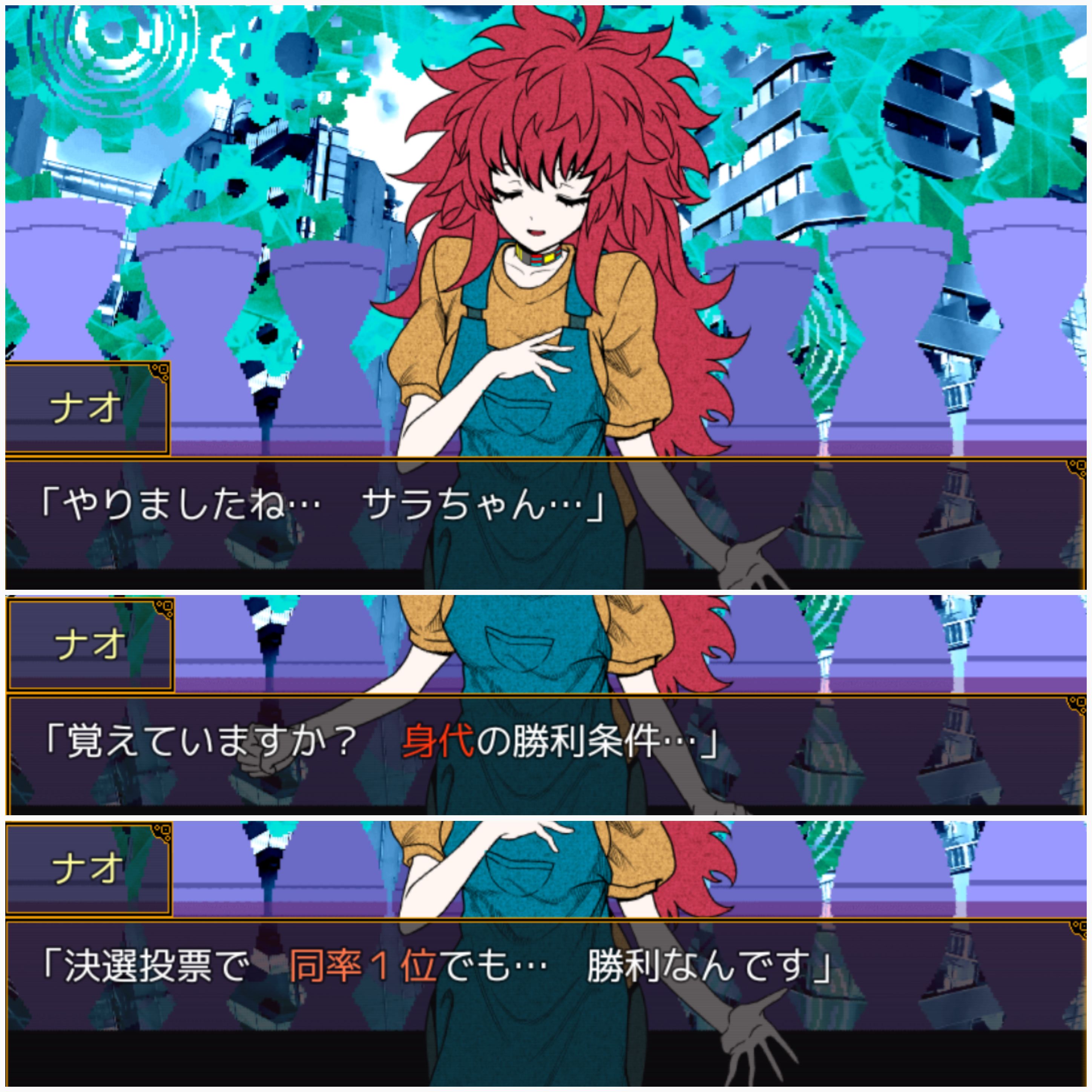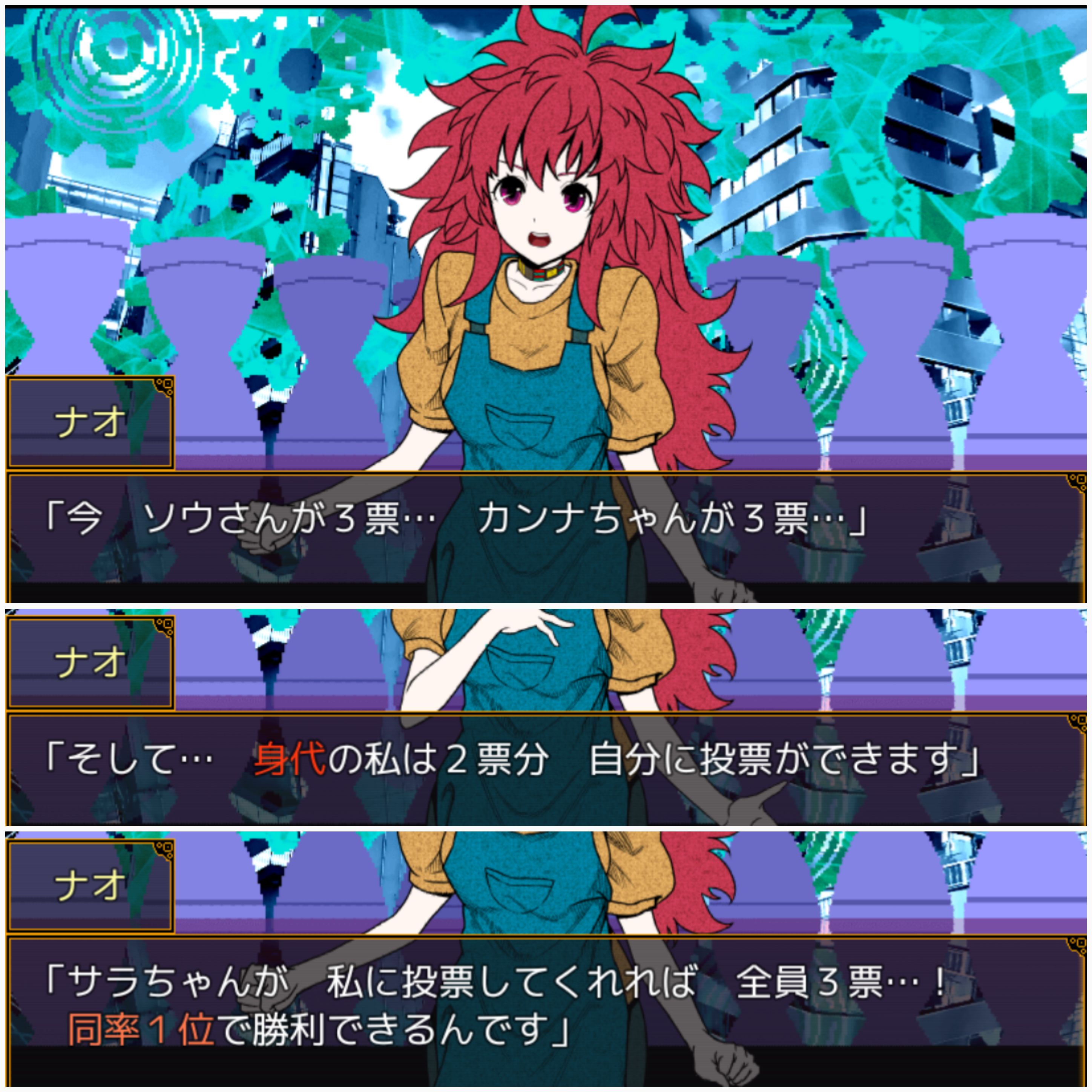 "사라 씨가, 제게 투표해 주신다면 전원 3표...! 동률 1위로 승리할 수 있어요."