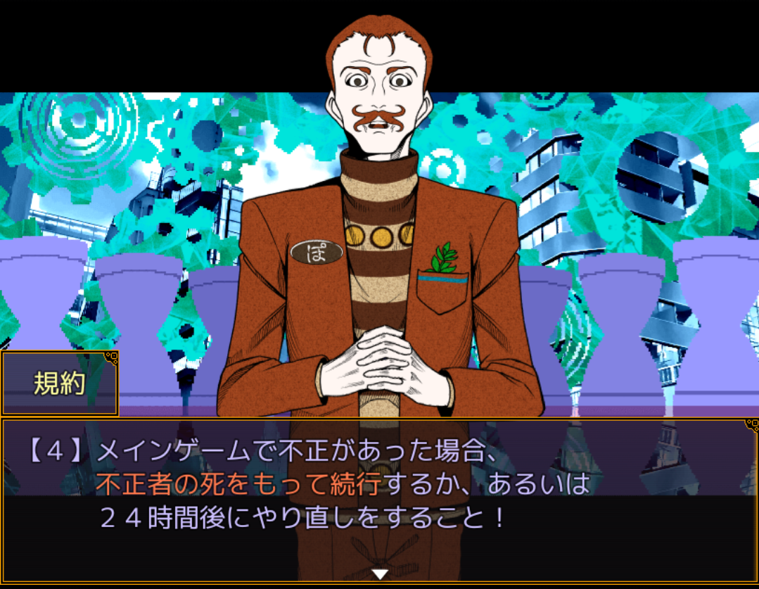 "메인 게임에서 부정이 있었을 경우, 부정자의 죽음으로 속행할지, 혹은 24시간 후에 다시 하는 것!"
