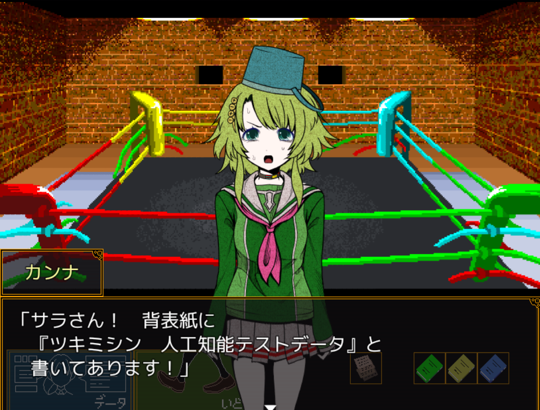 "사라 씨! 뒤표지에 '츠키미 신 인공 지능 테스트 데이터'라고 적혀 있어요!"