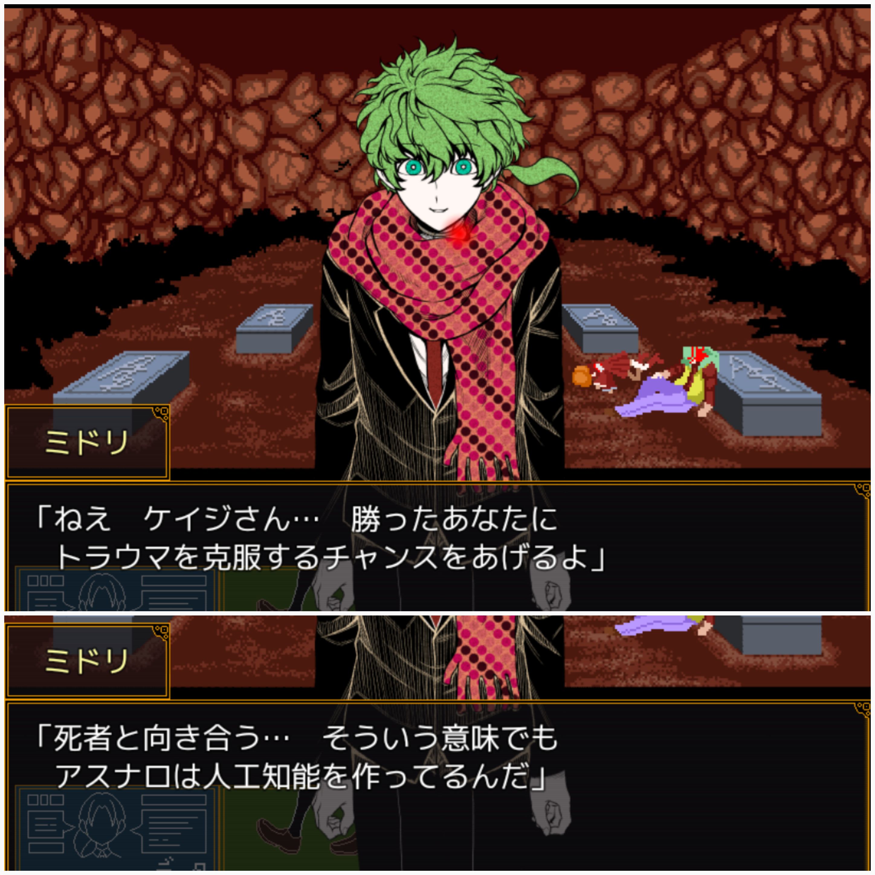 "죽은 자와 마주한다... 그런 의미로도 아스나로는 인공 지능을 만들고 있어."
