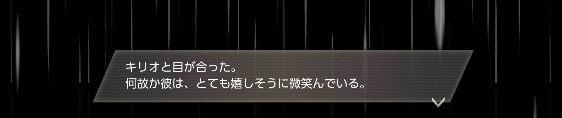 키리오와 눈이 마주쳤다. 어째서인지 그는, 무척이나 기뻐 보이는 듯이 미소짓고 있었다.