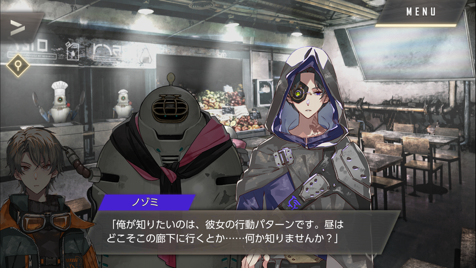 "10층에서는, 5체의 로봇이 신작 오토메 게임의 설계로 기획을 내고 있었어요. 그리고 마지막......"