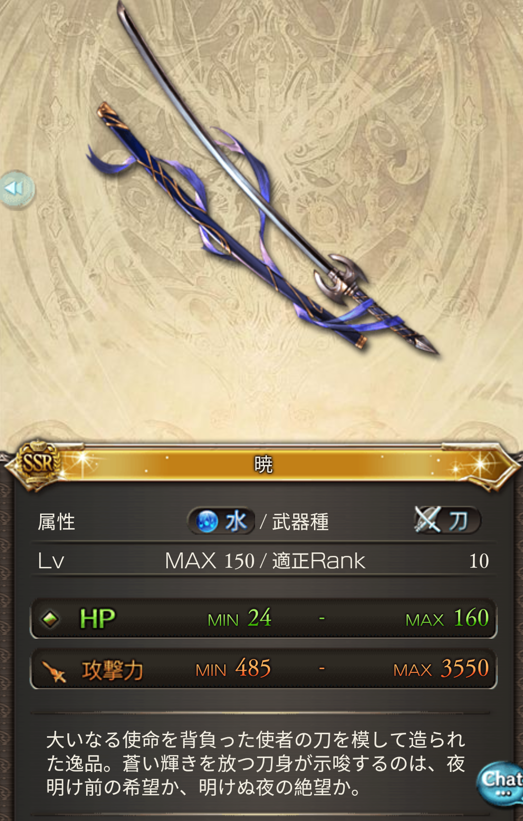 큰 사명을 짊어진 사도의 도를 모방하여 만들어진 일품. 푸른 반짝임을 발하는 도신이 시사하는 것은 동이 트기 전의 희망인가, 밝지 않은 밤의 절망인가.