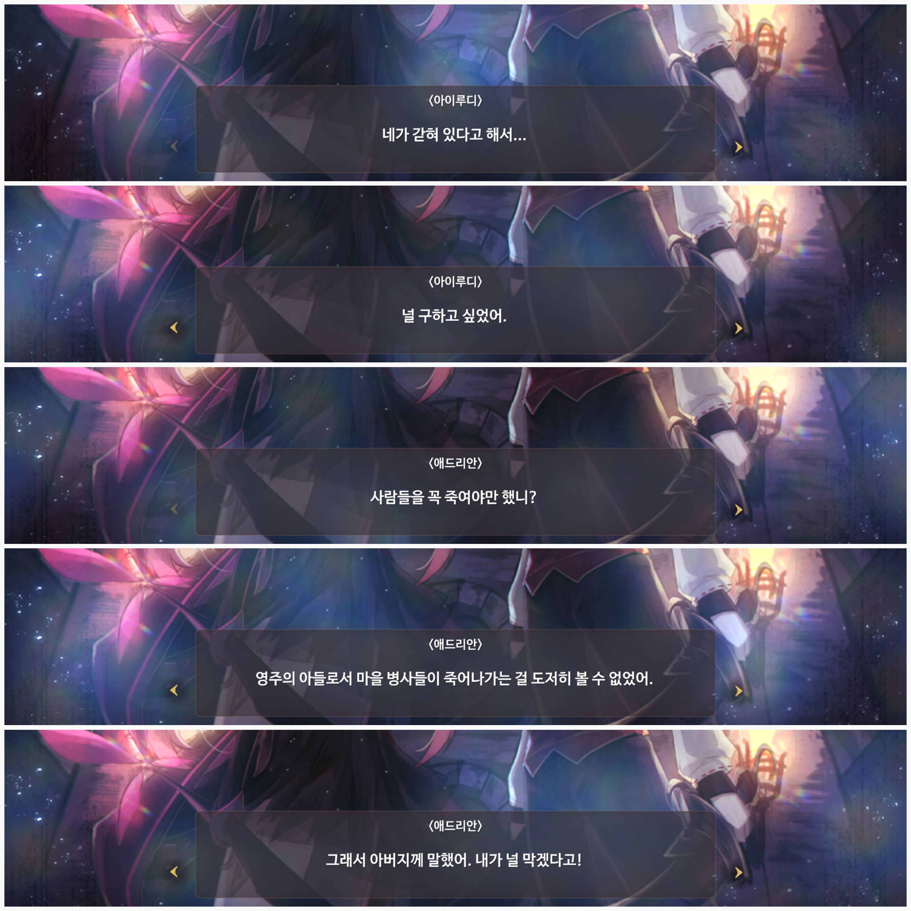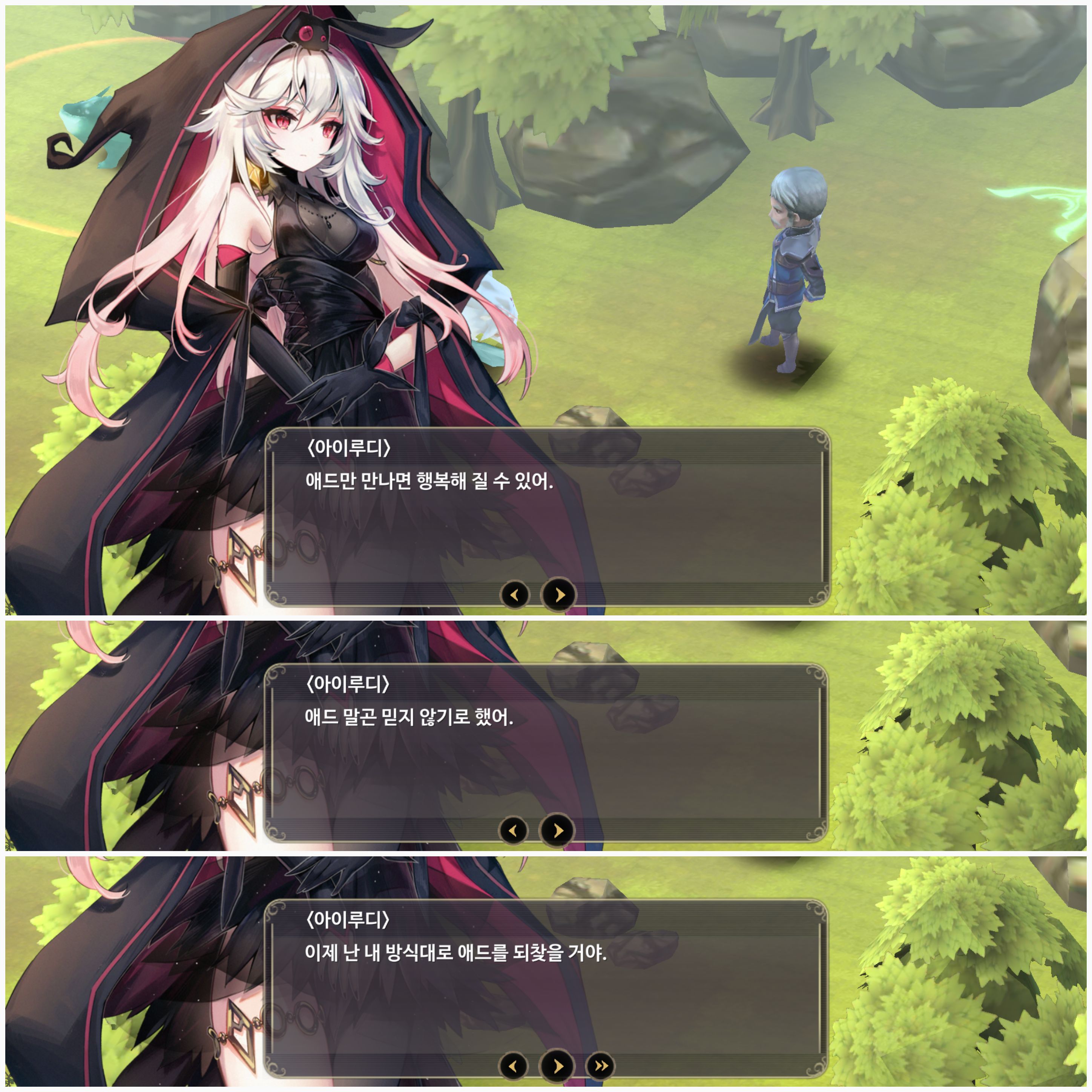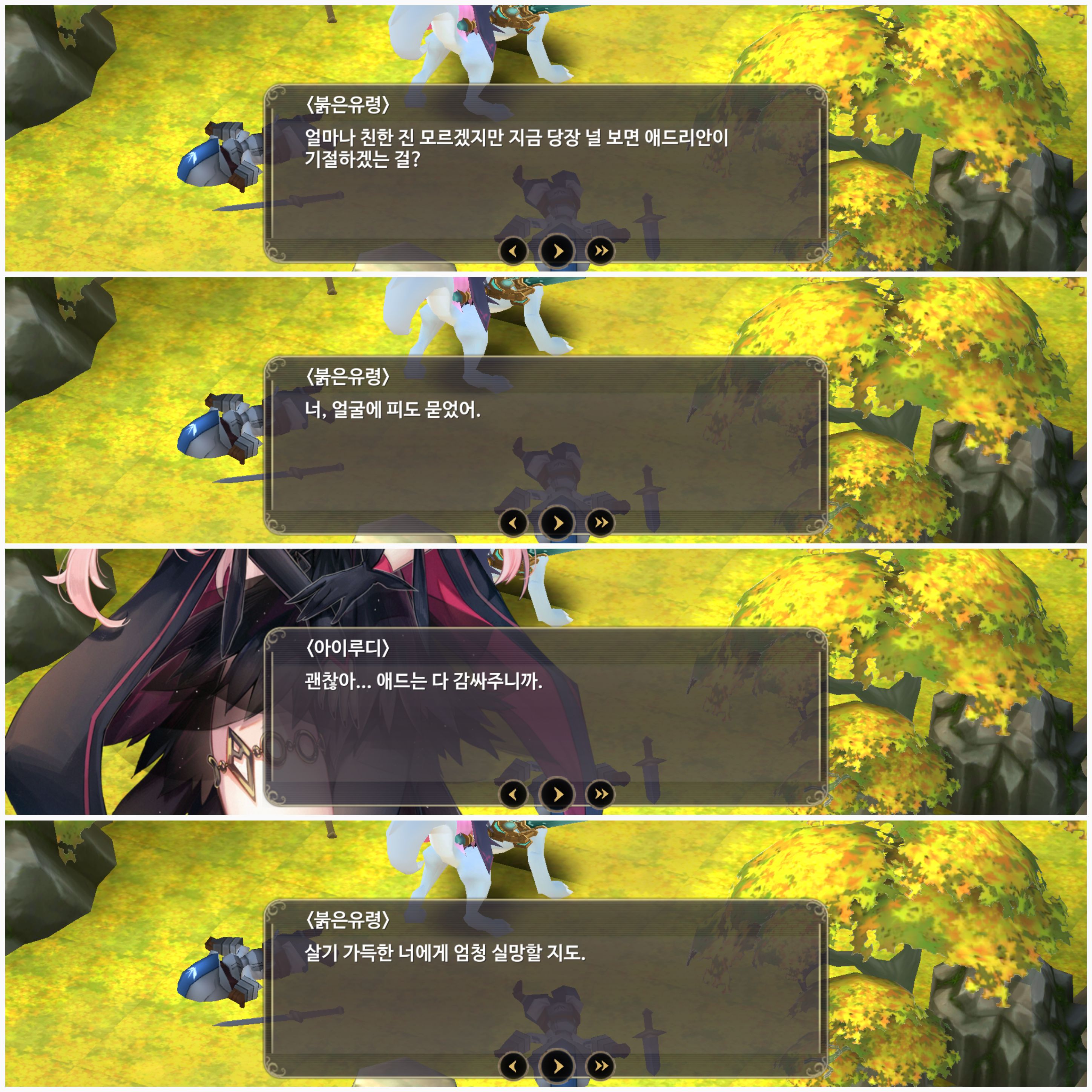 순백 루트에서는 헥터의 말 덕분에 아이루디가 삐뚤어지지 않고 다시 한번 애드의 마음에 대해 진지하게 고민하게 되는 계기가 되었는데 여기선 적이 되어 싸워야 한다는 사실이 슬프다