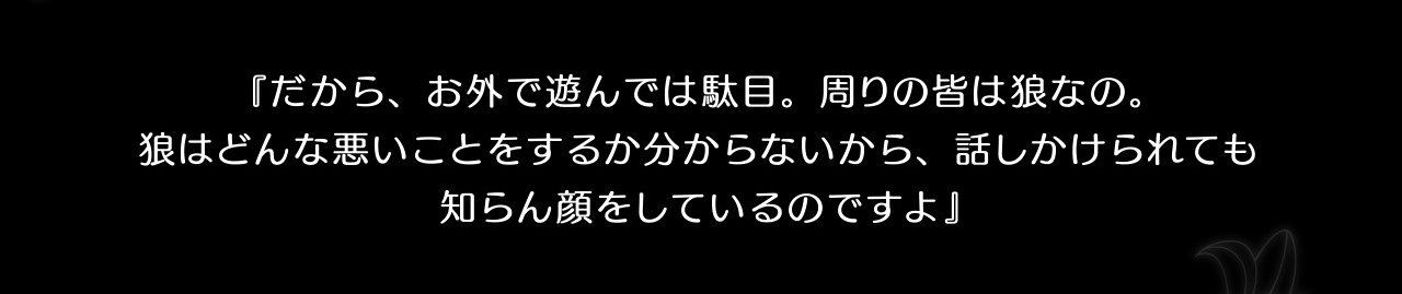 공략캐들의 어머니가 "알겠지? 너는 다른 아이와 달리, 무척 착한 아이란다. 그러니까 밖에서 놀면 안 돼. 주위의 모두는 늑대야. 늑대는 무슨 나쁜 짓을 할지 모르니까, 말을 걸어도 모르는 척을 하렴." 이라는 대사가 겹치는 건 물론이고