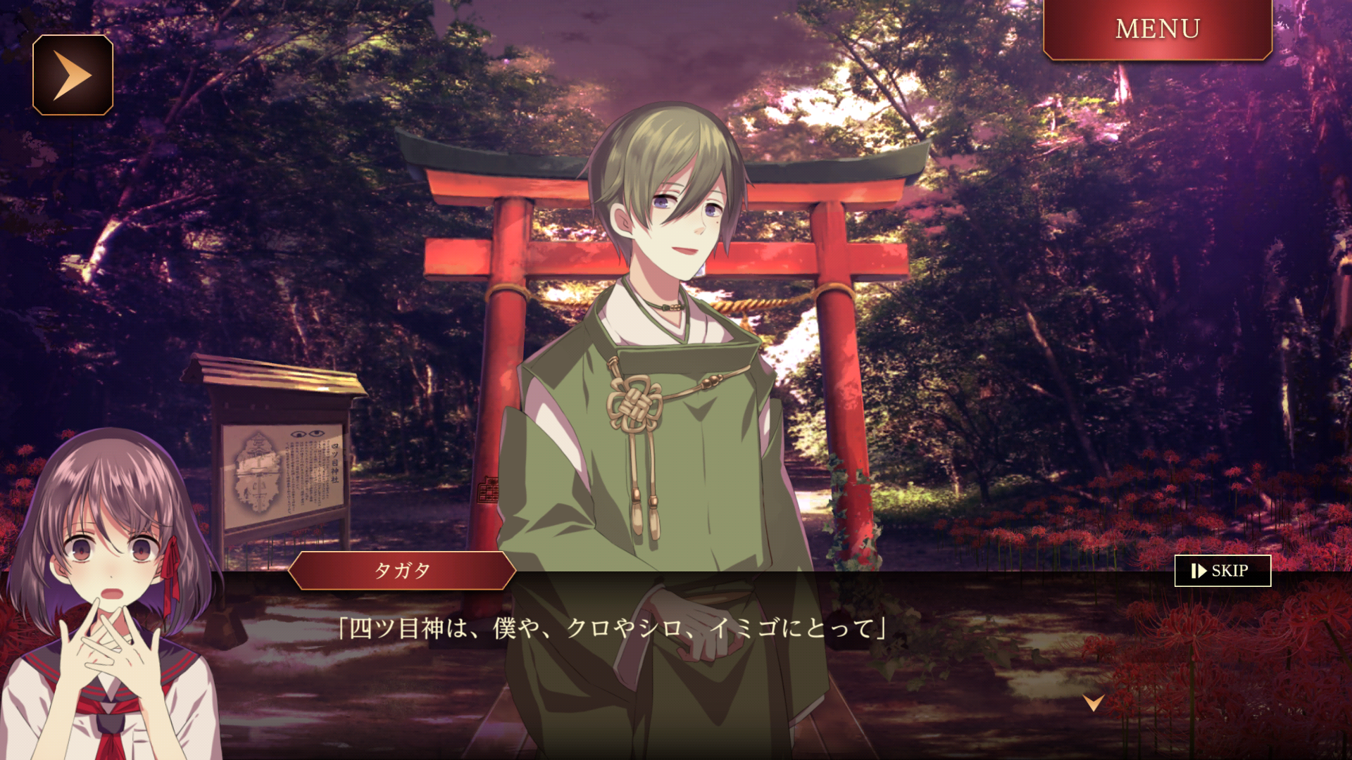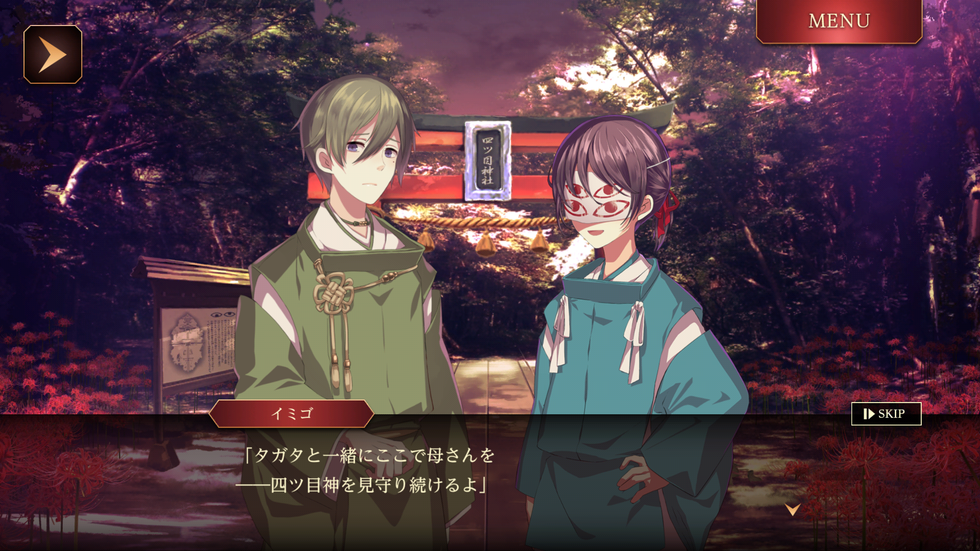 사가라 가의 이미고는 살해당해 네눈박이의 신이 되었고 형인 타가타는 가문의 사람들에 의해 죽어서 신으로 추앙받아 네눈박이의 신을 지켜보는 역할을 강요당했다