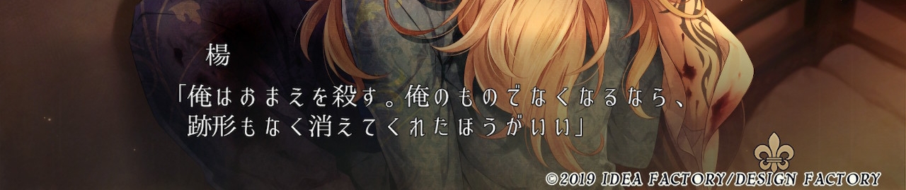 "내가 너에게 질리는 날이 온 때는, 어디든지 좋을 대로 가라. ......허나, 내가 손을 놓기 전에, 네가 도망간다고 한다면ー 나는 너를 죽이겠다. 나의 것이 되지 않는다면, 흔적도 없이 사라져 주는 편이 나아."