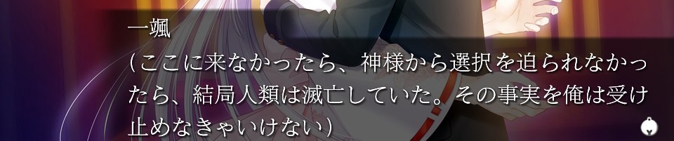 (이곳에 오지 않았다면, 신에게서 선택을 강요받지 않았더라면, 결국 인류는 멸망해 있었어. 그 사실을 나는 받아들여야 해.)