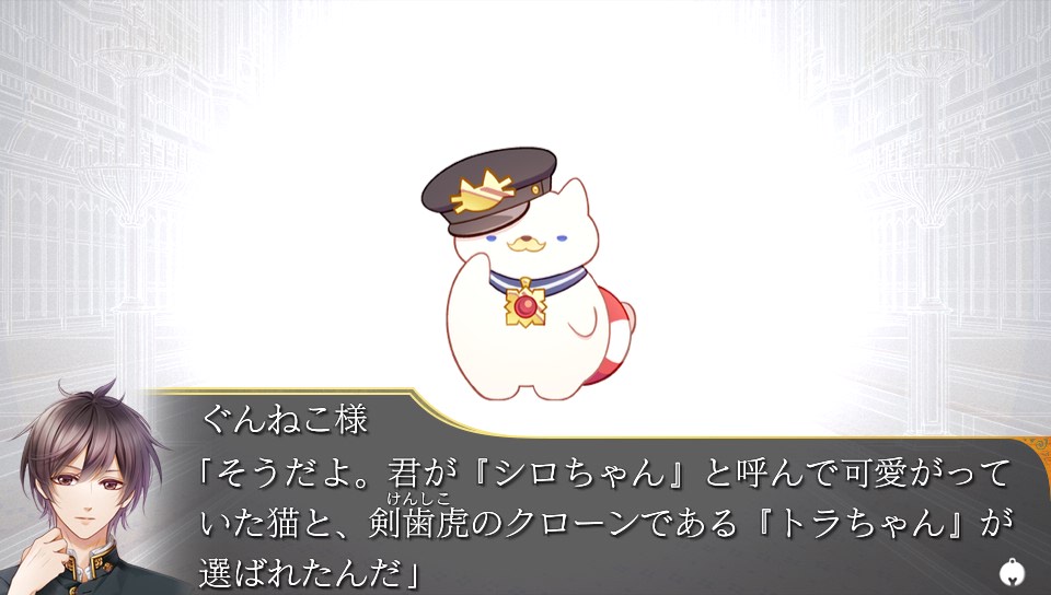 "그래. 네가 '시로쨩'이라 부르면서 귀여워했던 고양이와, 검치호랑이의 클론인 '토라쨩'이 선택되었어."