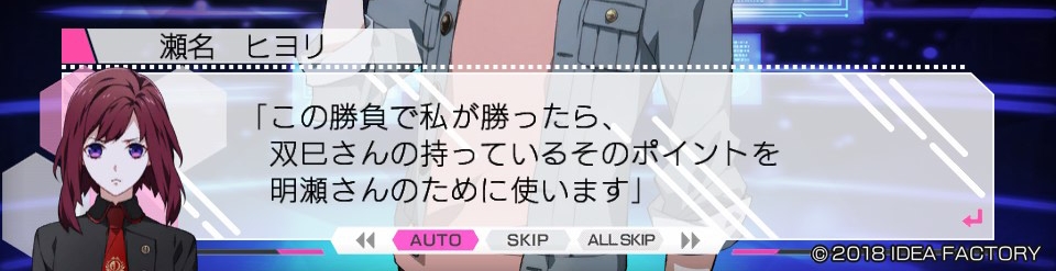 "이 승부로 제가 이긴다면, 후타미 씨가 보유하고 있는 포인트를 아카세 씨를 위해서 사용하겠어요."