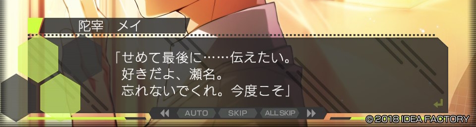 "적어도 마지막에...... 전하고 싶어. 좋아해, 세나. 잊지말아줘. 이번에야말로. 잊지말아줘...... 모두 잊어버려도, 나는 계속ー 잊지 않으니까."