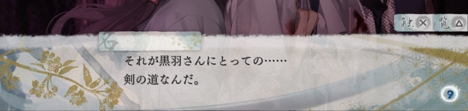 사람들을 위해 검을 휘두르겠다고 결심했어도, 사람을 죽이는 아픔을 분명 사라지지 않는다. 앞으로 쿠로바 씨는, 속죄의 아픔을 홀로 계속 견디게 되겠지. 그것이 쿠로바 씨에게 있어서...... 검의 길이다.