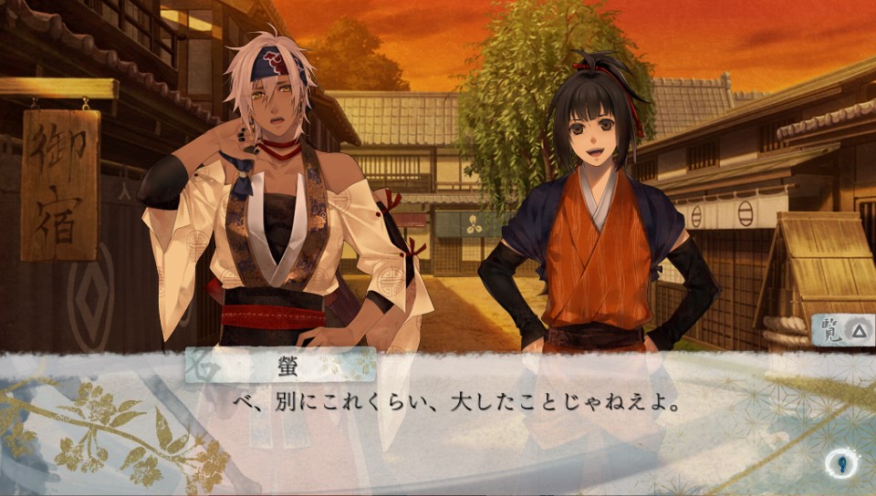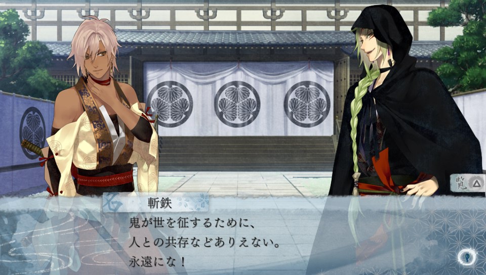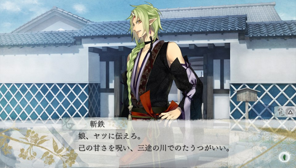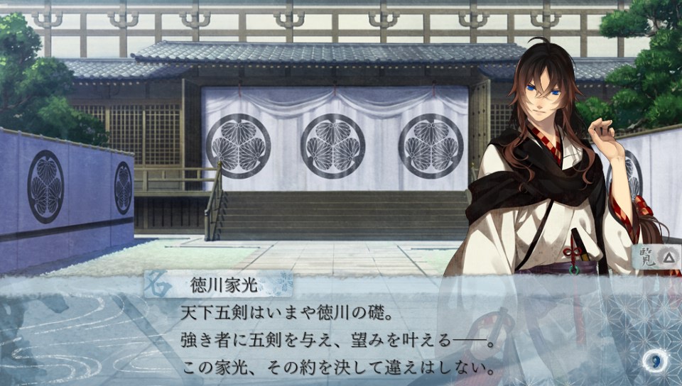 "얼굴을 들어라, 젊은 오니의 아이여. 인간과 오니족, 쌓인 이야기도 원한도 많다만, 우선 이겨서 마음의 떳떳함을 증명하도록. 천하오검은 이제 도쿠가와의 주춧돌. 강한 자에게 오검을 하사하고, 바람을 이루어주는ー. 이 이에미츠, 그 약속을 반드시 지키겠다."