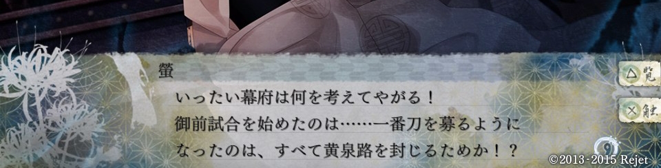 "대체 막부는 무슨 생각을 하는 거야! 어전시합을 시작한 건...... 일번도를 모으게 된 건, 전부 황천길을 봉하기 위해서인가!?"