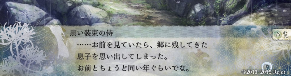 "......너를 보고 있으면, 고향에 남기고 온 자식이 떠오르고 말았어. 너와 마침 또래 정도인데. 너와 달리 얌전하다고는 무척 말할 수 없는 성격이야. 손이 가는 일도 있지."