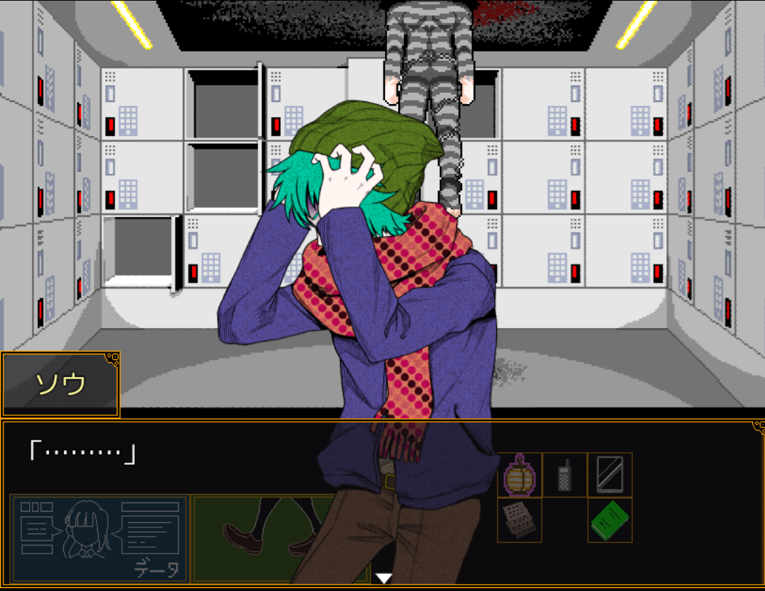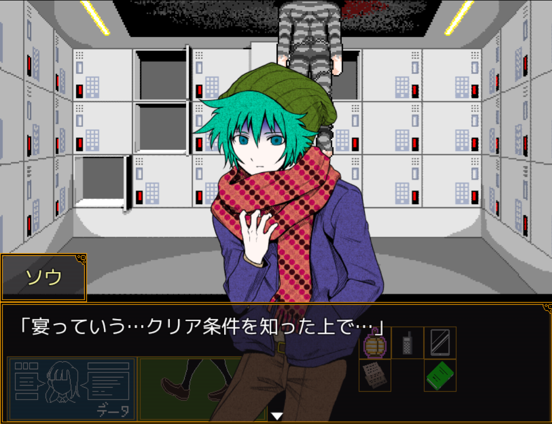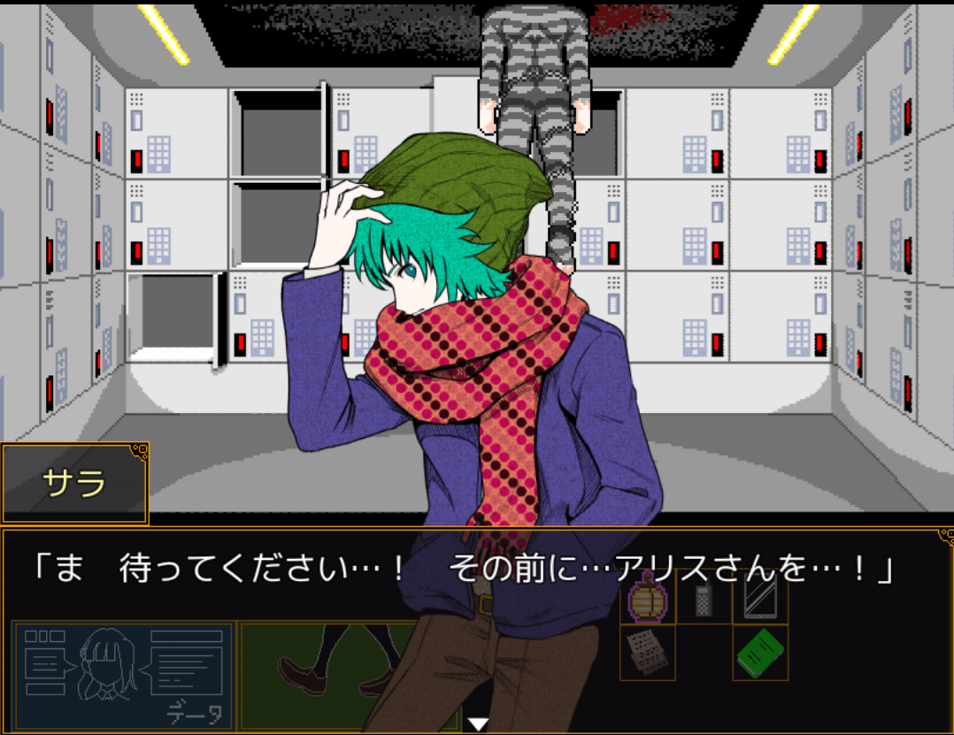 "이 녀석은 거짓 방송으로... 사라에게서 ID 카드를 빼앗은 후... 그 ID 카드를 사용해 제어실에서 교살의 함정을 발동시켰어...!! 로커룸에 혼자서 있던 아리스를 노리고...!!"