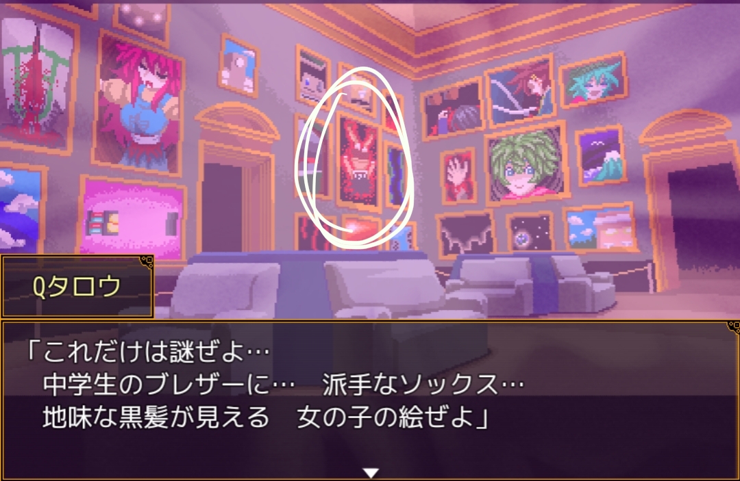 Q타로 "이것만은 수수께끼라고... 중학생의 블레이저에... 화려한 양말... 평범한 검은 머리가 보이는 여자 아이 그림이다."