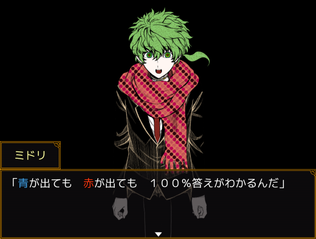 "살았다! 적색이라는 건... 긴이 아니야! 이게 미도리라면... 승리라고...!! 첫 번째 힌트로 적색이었던 1번 관과 조건은 같지만! 원래라면... 지금부터 이야기를 나눠 히트할 관을 고르고 싶지만... 솔직히... 지금 관인가 1번 관인가 어느 쪽을 고를 수밖에 없어..."