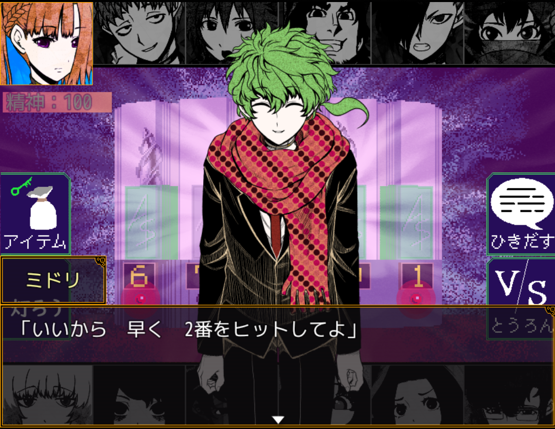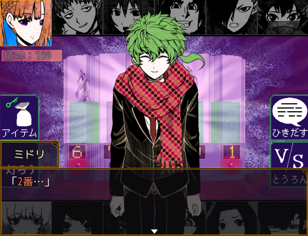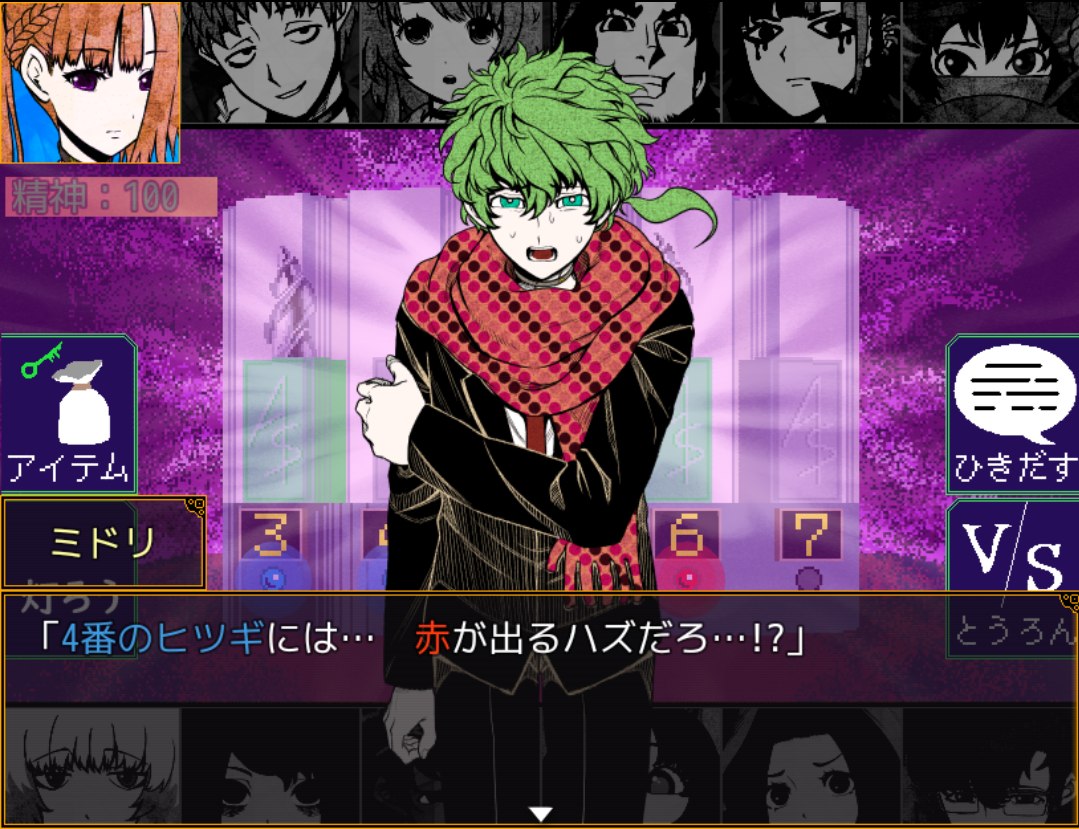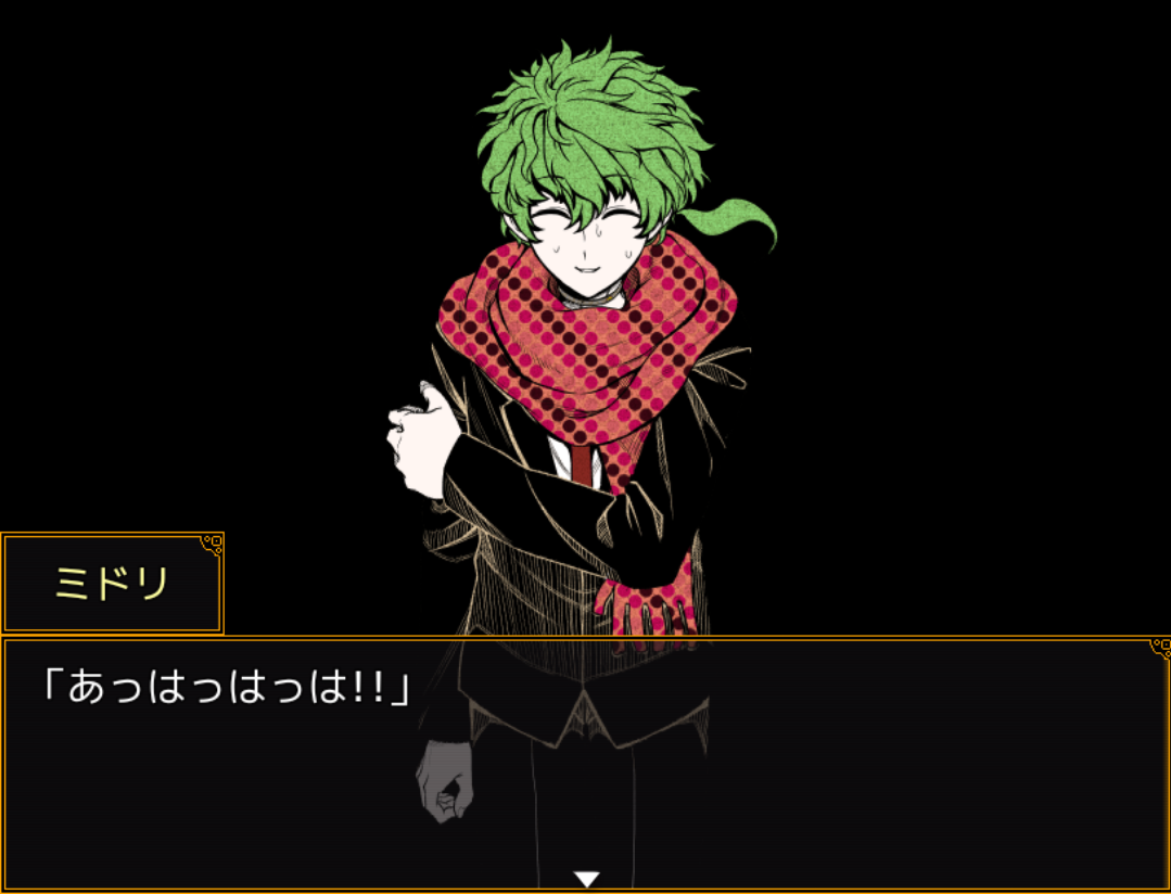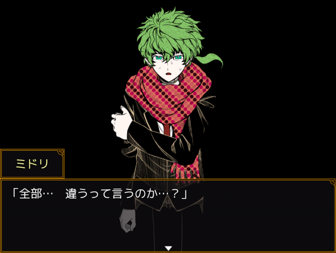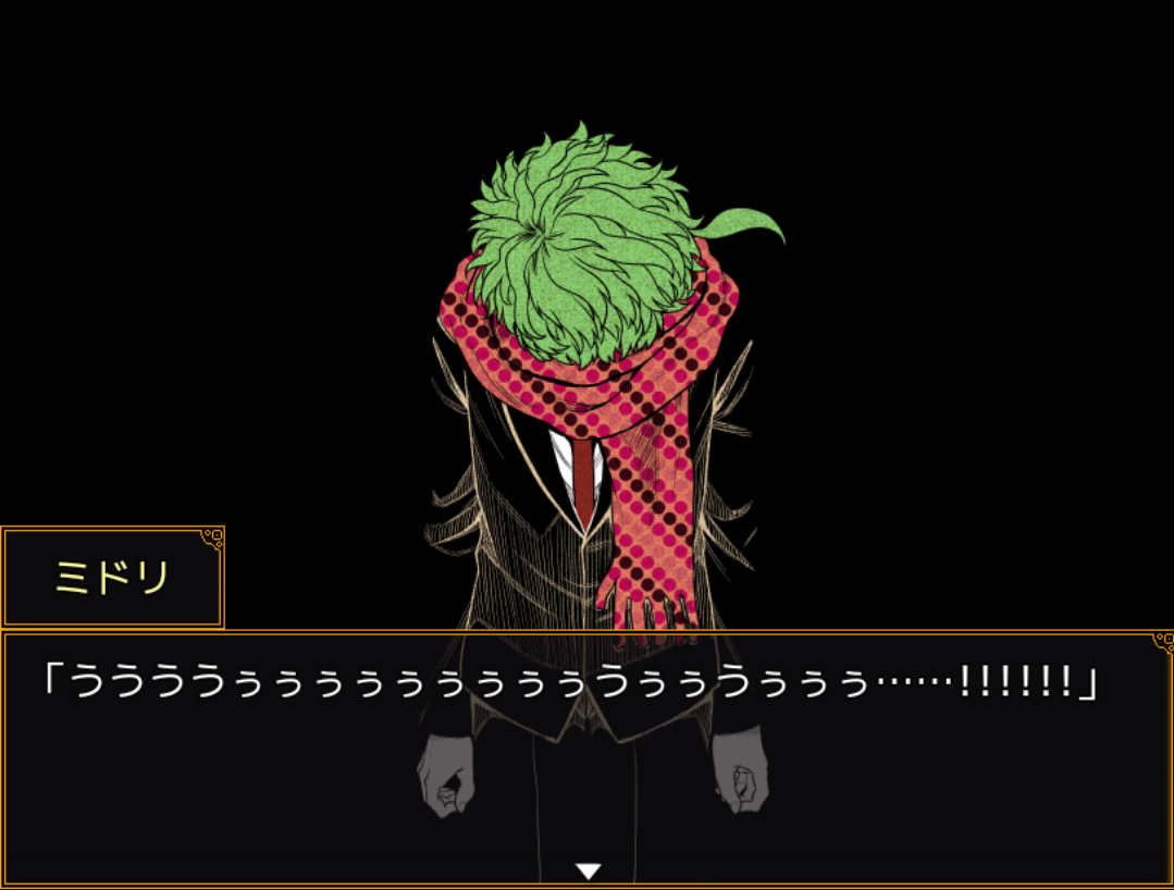 미도리 "...3대 있다고? 자... 봐 봐. 너는... 빛나지 않는 관 3대 중에서 나를 맞혀야 해. 그리고... 더이상 단서는... 없어. 그런가... 최후의 힌트를 쓸 수 있었네. 어느 쪽을 골라도... 적색이 나올 뿐이야. 힘껏 이야기 나눠 보라고..."