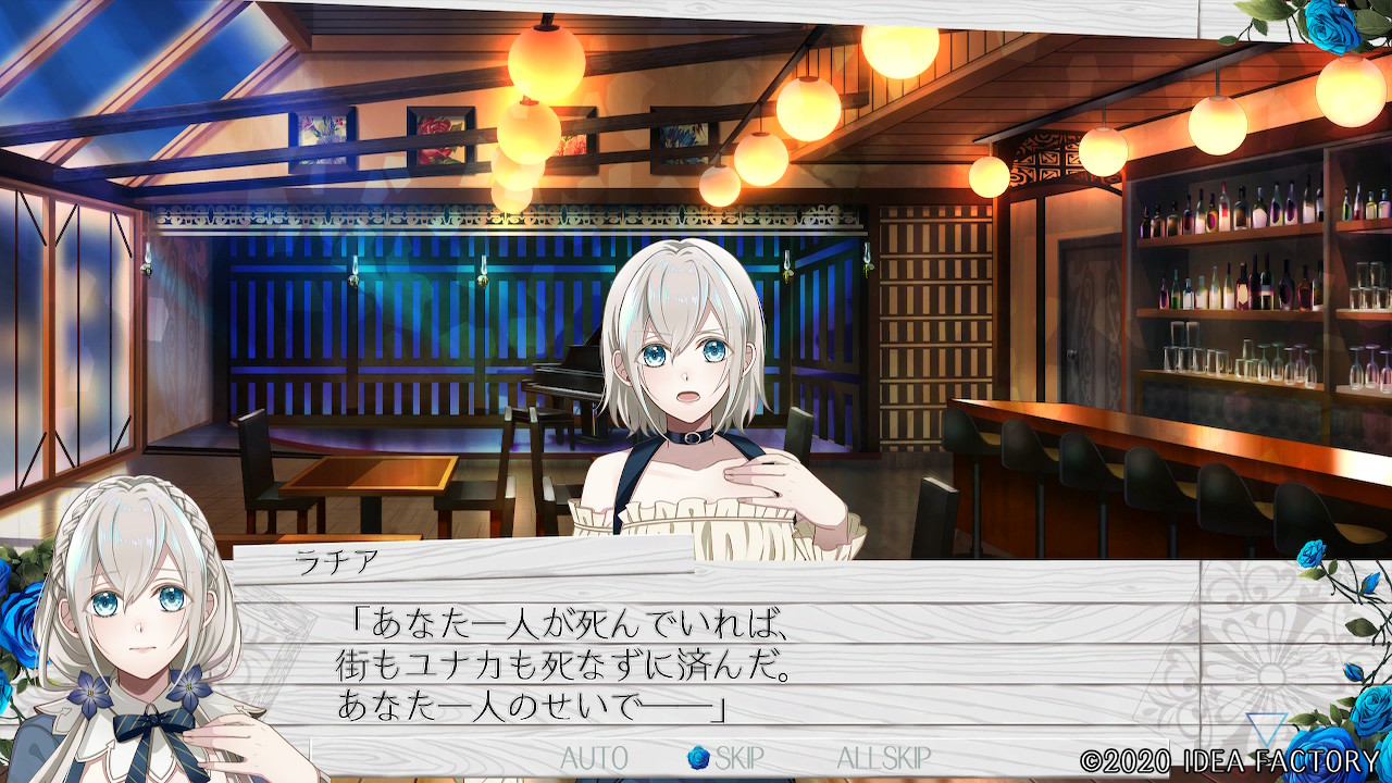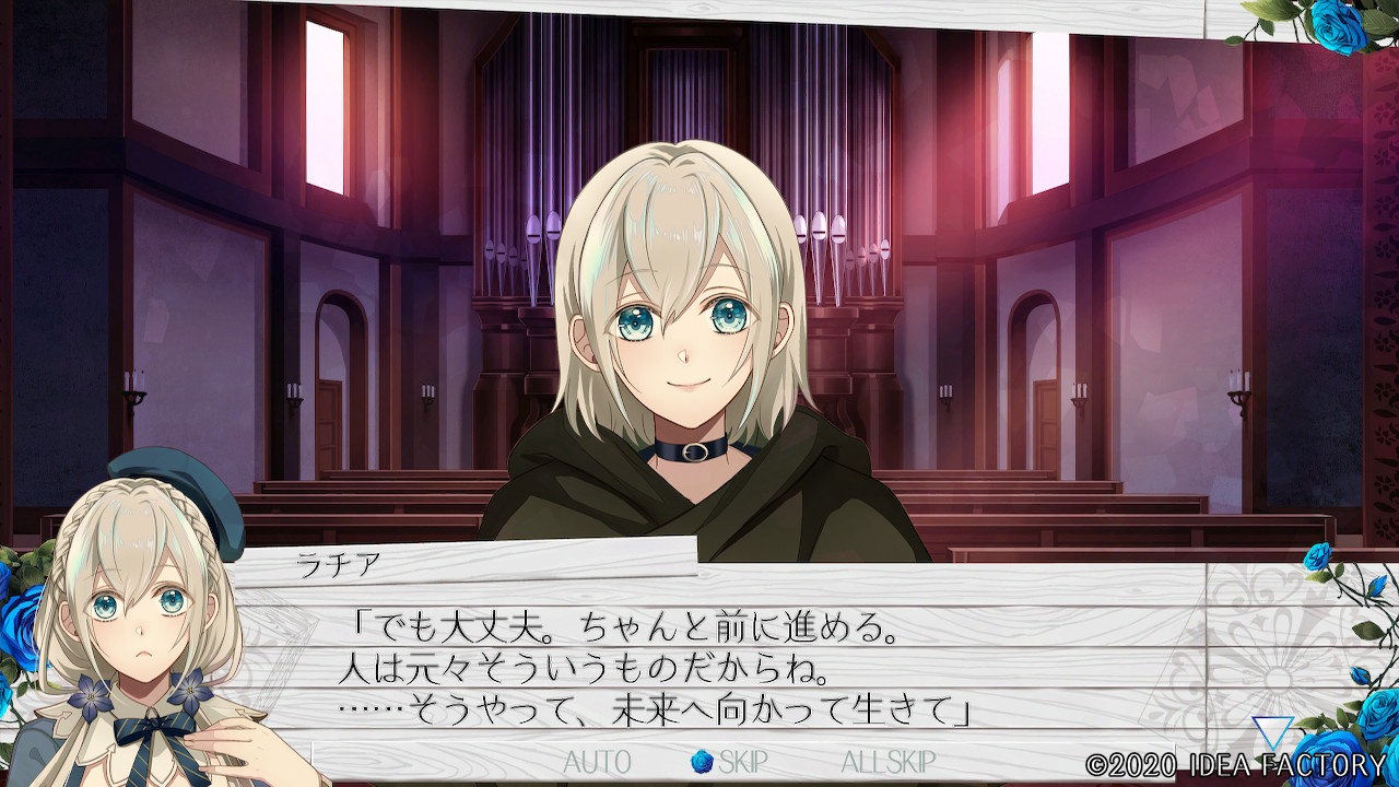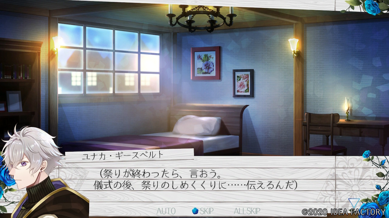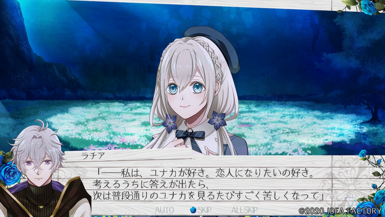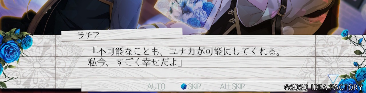 "푸른 장미의 꽃말은 '불가능'ー 존재하지 않는 것으로 불리는 듯해. 하지만 지금 이렇게 유나카가 푸른 꽃을 주었으니까. 그런 건 어찌되든 상관없어져 버렸어."