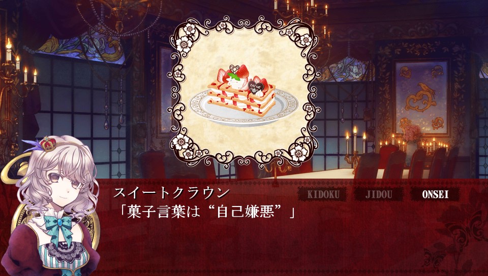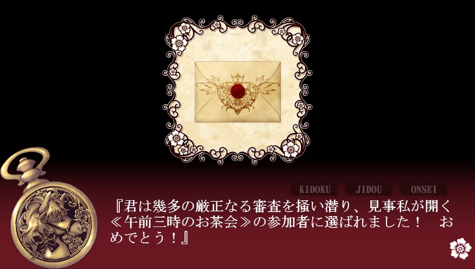 "당신은 수많은 엄정한 심판을 통과하여, 훌륭히 제가 개최하는 《오전 세 시의 다과회》의 참가자로 선정되셨습니다! 축하드립니다!"