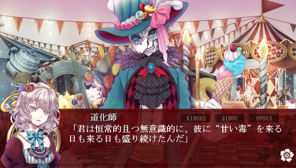 "그를 입에 댔을 때, 곧바로 눈치채서 토해냈지만 말이야. ......하지만 늦었어. 내 몸에는 '그의 요소', 즉 '너에게로의 무의미하게 비대한 어리석은 연애 감정'이 돌고 말았지. 내가 너를 원하고 있던 이유는 이거야, 자쿠로. 내 안의 그가, 너를 바라고 있었어."