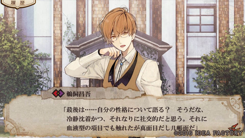 "마지막은...... 자신의 성격에 대해 말하라? 글쎄, 냉정 침착하고도, 그런대로 사교적이라고 생각해. 거기다 혈액형의 항목에서도 언급했지만 진지하고 착실하다."