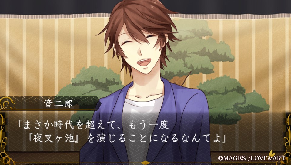 연극 배우로 대성공해서 다시 야샤가이케를 연기하게 된 오토지로. 공략캐 중에서 가장 현대에 어울리기도 하고 적응 잘할 것 같은 이미지가 있다ㅋㅋ