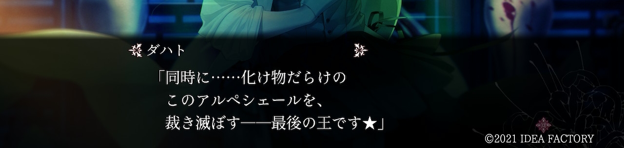 "리암 레브포와르의 이름하에 지금 이곳에서 선언한다. '죽음'으로 타락한 너희들을, 나는 아르페셀 국민으로서 인정하지 않아. 구하지 않아. 내가 앞으로 통솔할 나라의 미래에, 너희 같은 '이상자'들은 일절 필요없어ー 죽음을 받아들이는 자도, 죽음에 어리광 부리는 자도ー"