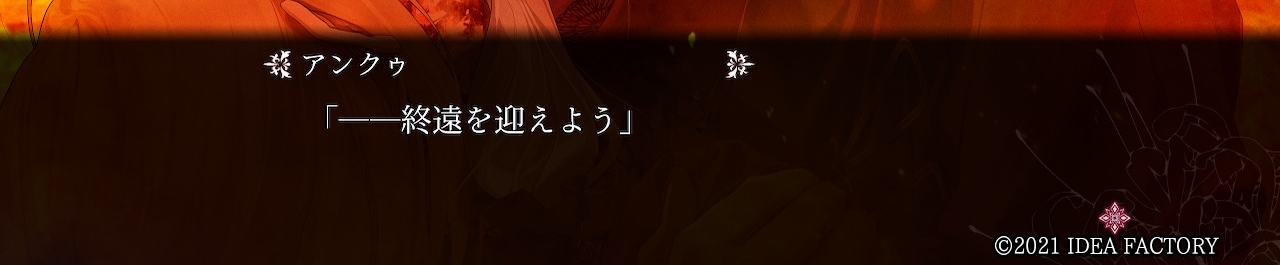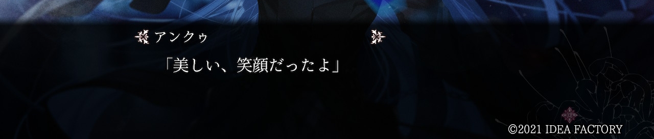 "이제 두 번 다시ー 너를 혼자서는 죽게 하지 않아. 계속 내가 있겠다. 착각해도, 자랑스러워할 역할은 아니지만ー 이것이 안쿠로서, 네게 바칠 수 있는, 세상에서 유일한 사랑의 형태야ー 잘 자, 세레스. 이 입맞춤으로, 영원의 죽음을 맹세하고ー 종원을 맞이하자."