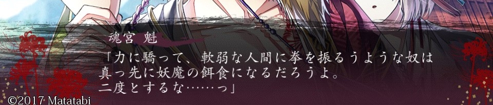 "힘에 교만해, 유약한 인간에게 주먹을 휘두르려고 하는 녀석은 가장 먼저 요마의 먹이가 될 테다. 두 번 다시 하지 마......"