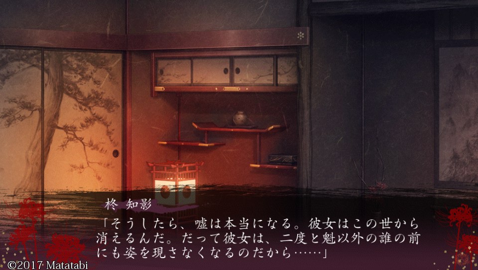 히이라기 "그렇다면ー 거짓말을 진짜로 만들면 돼. 그녀를 소중히 간직하면 돼. 아무에게도 보여주지 않고, 아무와도 만나게 하지 않고, 소중하게 가둬두는 거야. 그렇게 하면, 거짓말은 진짜가 돼. 그녀는 이 세상에서 사라지는 거야. 그야 그녀는, 두 번 다시 카이 이외의 누군가의 앞에도 모습을 드러내지 않게 되니까......"