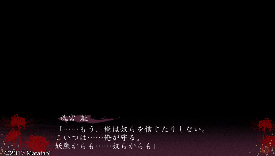"나의 부모님을 내버려둬 죽게 한 녀석들과 같아. 아무것도 바뀌지 않았어. 그 녀석들은 변하려는 생각 따위 없어. ......이제, 나는 녀석들을 믿거나 하지 않겠어. 이 녀석은...... 내가 지킨다. 요마에게서도...... 녀석들에게서도."