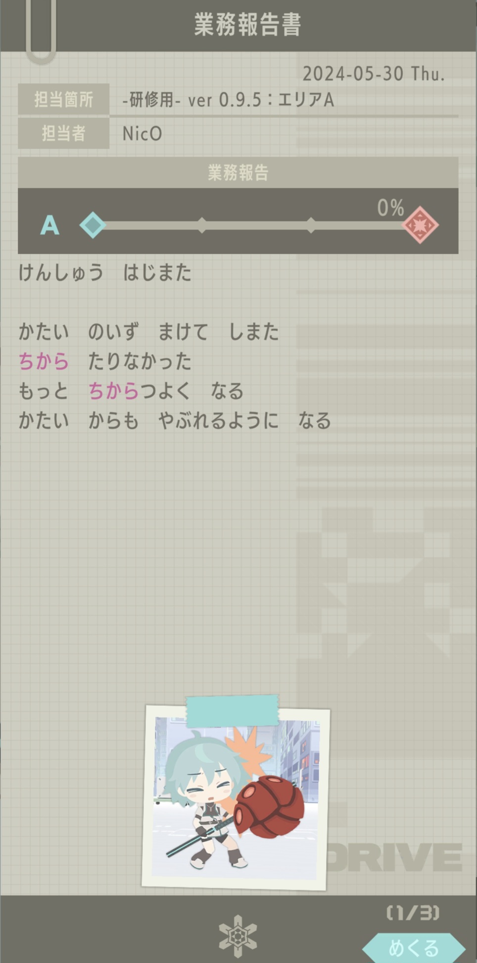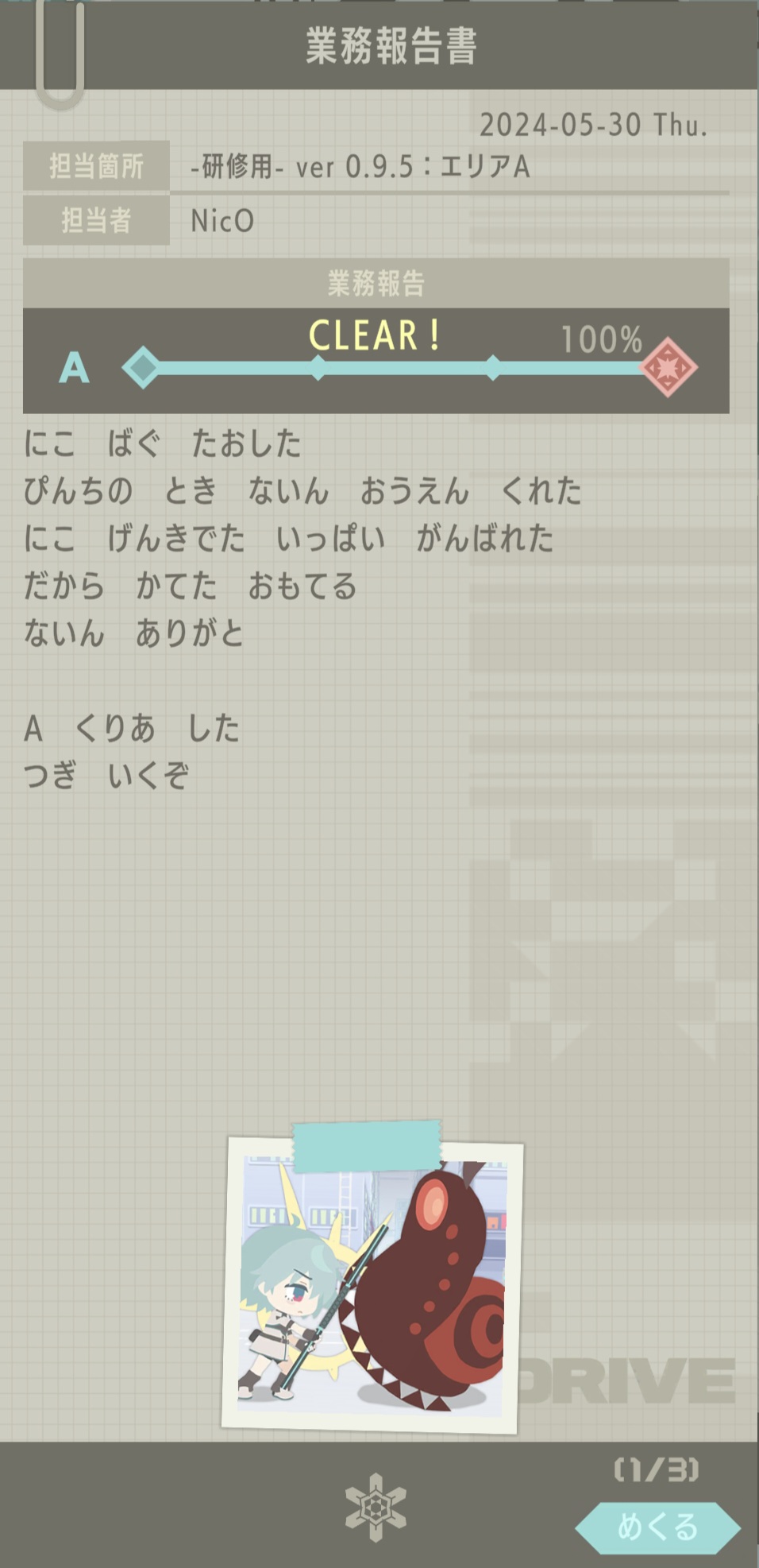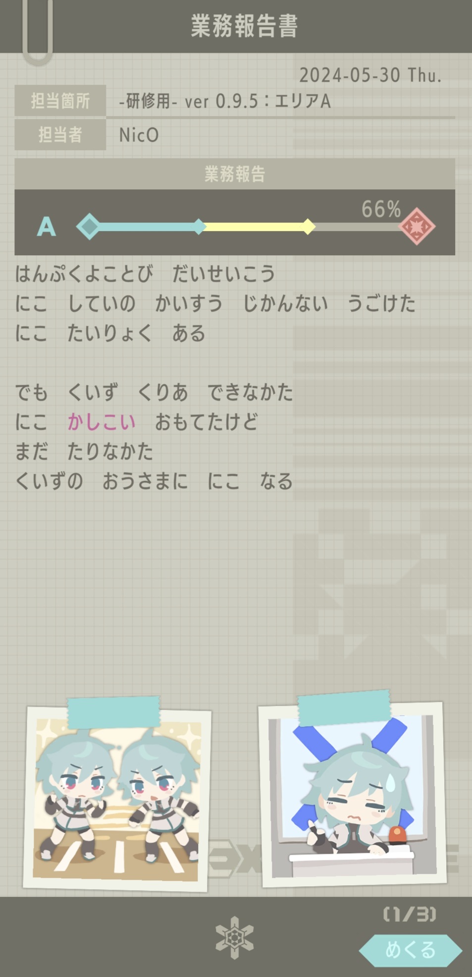 연수에서 돌아오니 갑자기 니코가 보스를 쓰러뜨릴 수 있을 것 같다며 배틀에 나선다. 도중에 플레이어가 니코를 터치를 연타해서 응원하는 부분이 있어 마구 눌러줬다
