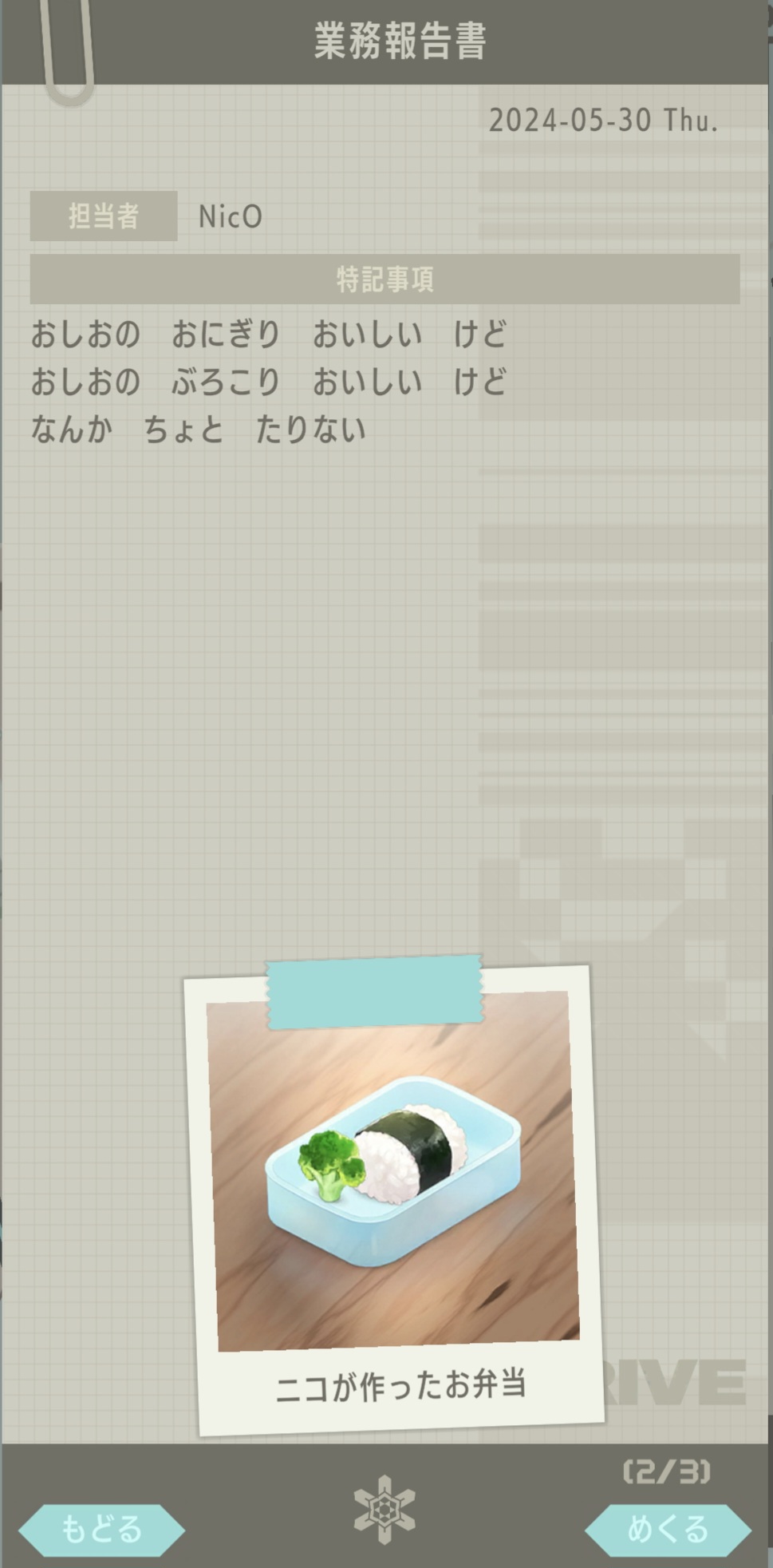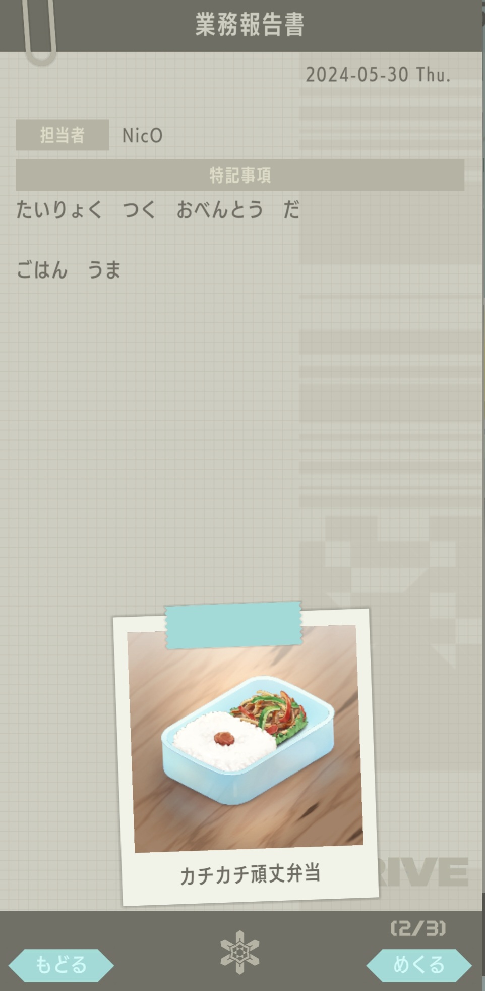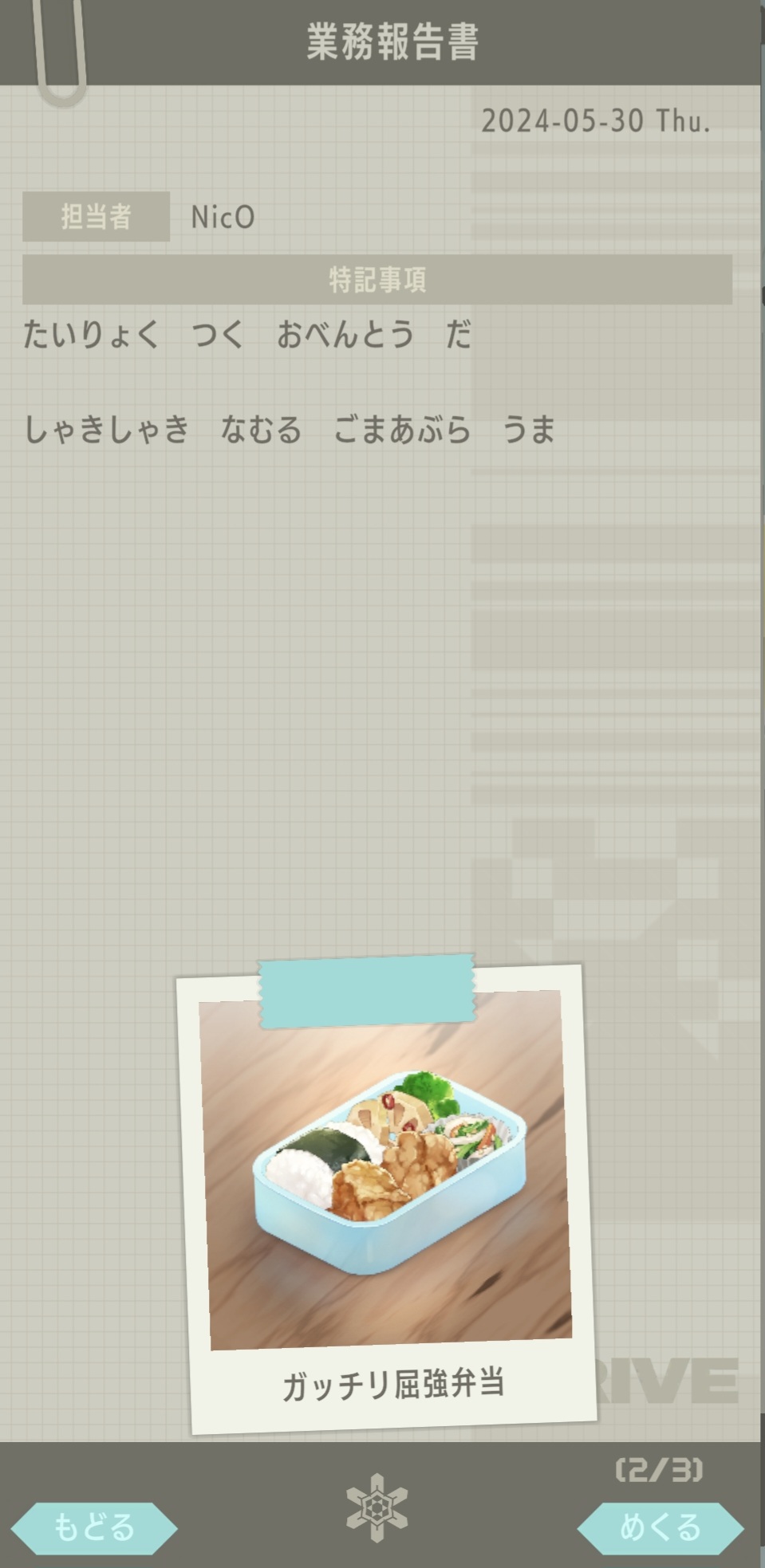 포스팅하면서 깨달았는데 돈까스 도시락처럼 메인 메뉴를 두고 만드는 도시락은 특정 이름이 붙는데 능력치만 생각하고 때려 넣은 도시락은 이름도 애매하고 보고서도 부실하다. 내일 연수 진행은 느긋하게 하기로 하고 능력치보단 도시락 만들기에 더 힘을 쏟아봐야겠다
