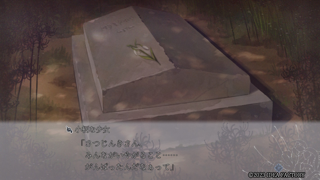 "무서운데도, 가는구나. '죽음'은 그렇게 두려운데. '한순간'으로 얻은 나조차도, 그렇게 괴로웠는데...... ......망설이게 해서, 미안해. ......하지만 어떻게 해서든ㅡ 당신들을, 독점해보고 싶었어. ......조심해. 명계의 심술쟁이는, 나의 장난 따위 보다, 훨씬 괴롭고 악취미하니까."