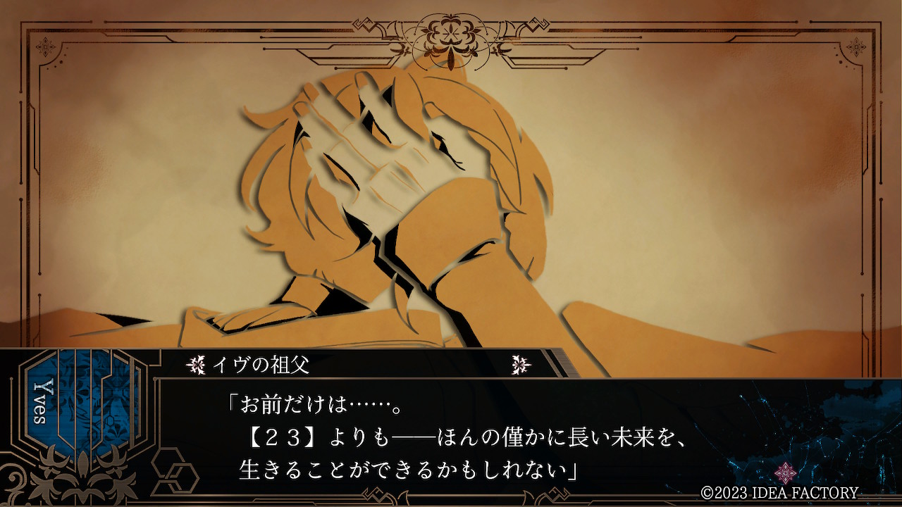 "............너는 말이지. 너의 아버지나, 나보다도 훨씬ㅡ 시조님의 피를, 짙게 이어받고 있단다. 너만은...... '23'보다도...... 정말 조금 긴 미래를, 살 수가 있을지도 모른다. ......만일, 그렇게 된다면, 아무에게도 그 것을 밝히지 않고, 몸을 숨기렴...... 나는...... 네가, 신의 아이의 실험체가 되는 건, 참을 수 없어...... 언젠가 해후할 소중한 여자 아이와, 그 바람을 이루어야 한다......?"