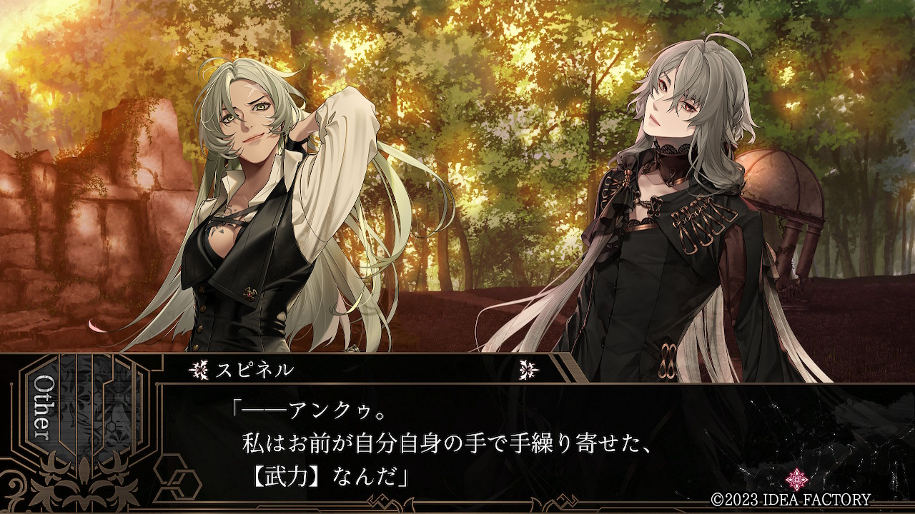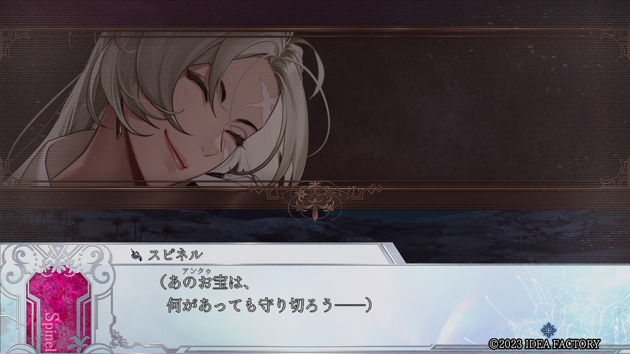 스피넬 "그건...... 틀려. 계약과는 다른 이유가 있다고 해야 하나. ......이유를 말해도 괜찮지만. 그걸 들으면 너는 아마 화낼 거야. 꽤나 화낼 거야. ......목소리가. 너의 목소리가, 닮았어. 옛날 전장에서 서로 사랑한ㅡ 이 손으로 죽인, 한 명의 남자와. 그래서 어떻게 해서든, 내버려 둘 수 없었어. 최종적으로 우리들은, 용병으로서의 신념을 관철해ㅡ 서로 죽이는 길을 택했어."