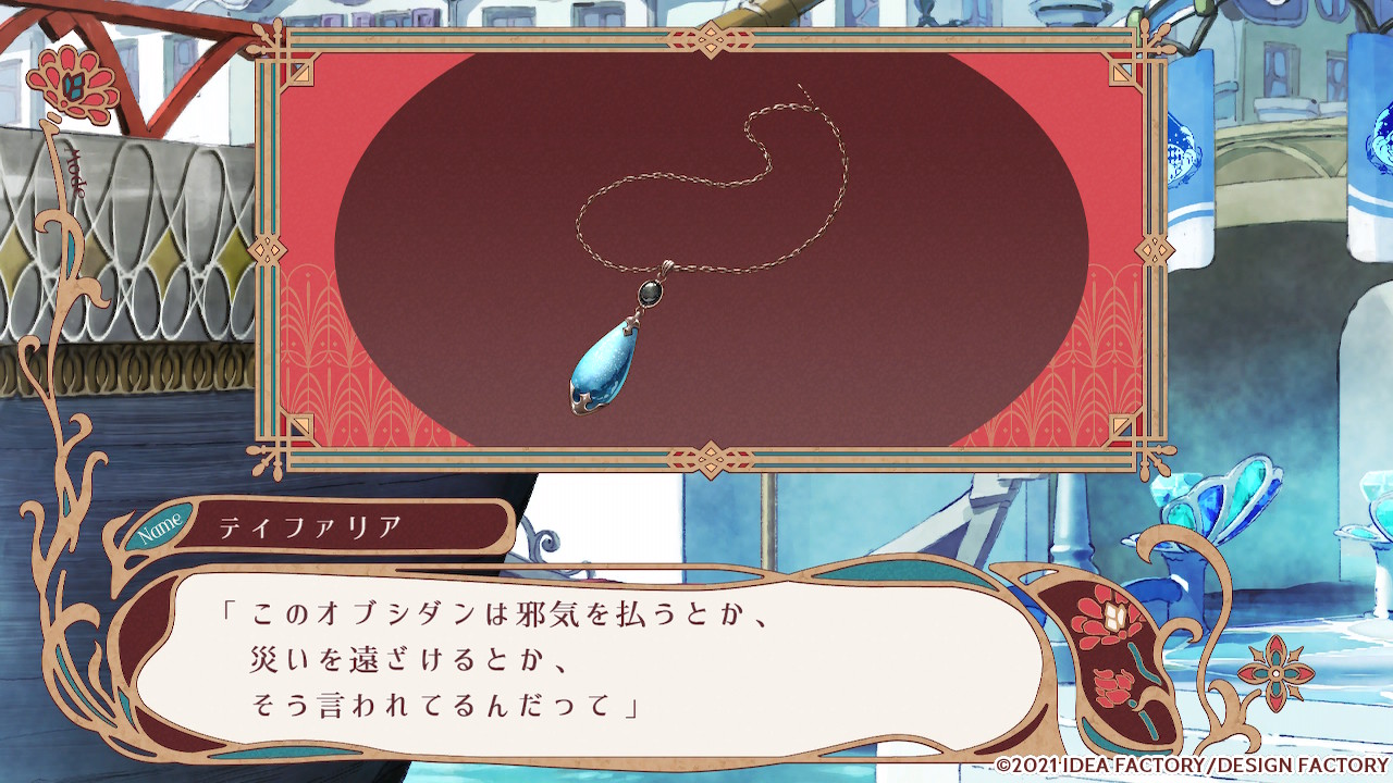 "......이거, 가게에서 샀어. 바람이 이루어진다고 하는, 라크리마의 레플리카래. 이 옵시던은 사악한 기운을 쫓는다든가, 재앙을 물러가게 한다든가, 그렇게 불린다고."