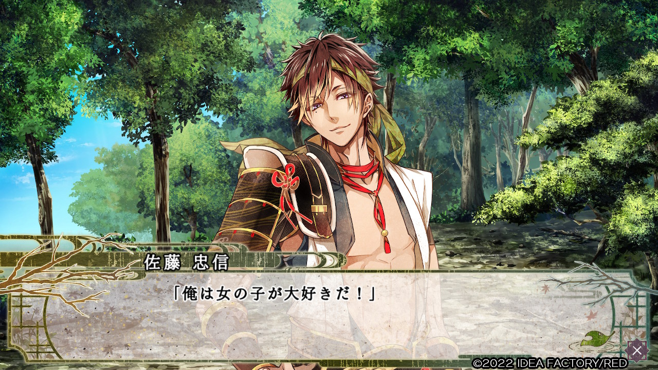 타다노부 "뭐야 뭐야, 연애를 피하다니. 승려인 벤케이는 그렇다 쳐도, 샤나오님과 슌겐은 손해보고 있는 거 아니야? 사랑은 좋다고! 매일이 충실해져! 좋아하는 상대와 닿은 때의 마음의 두근거림은 무엇과도 대신할 수 없어. 나는 여자 아이가 정말 좋아!"