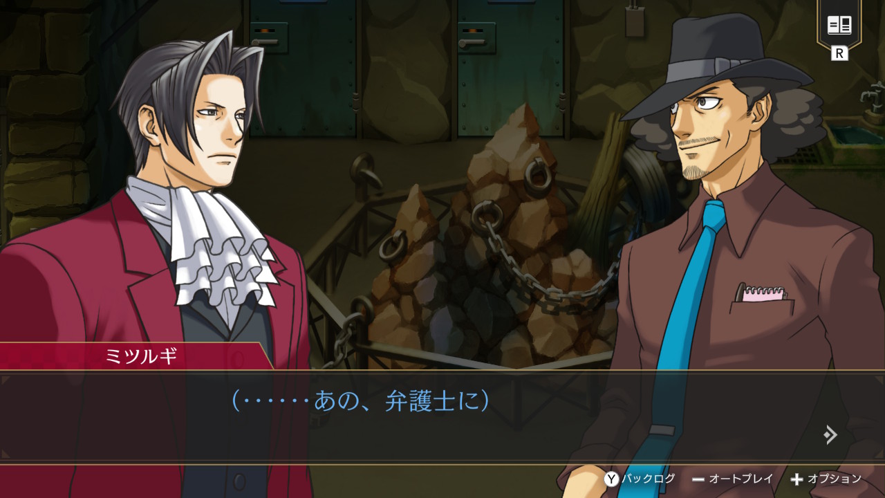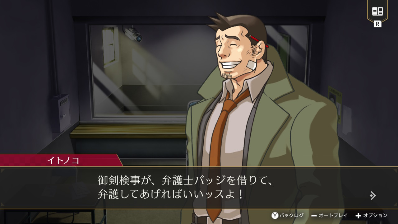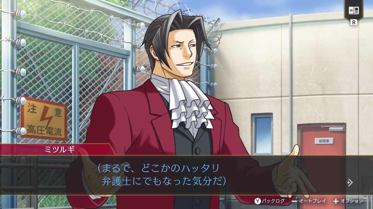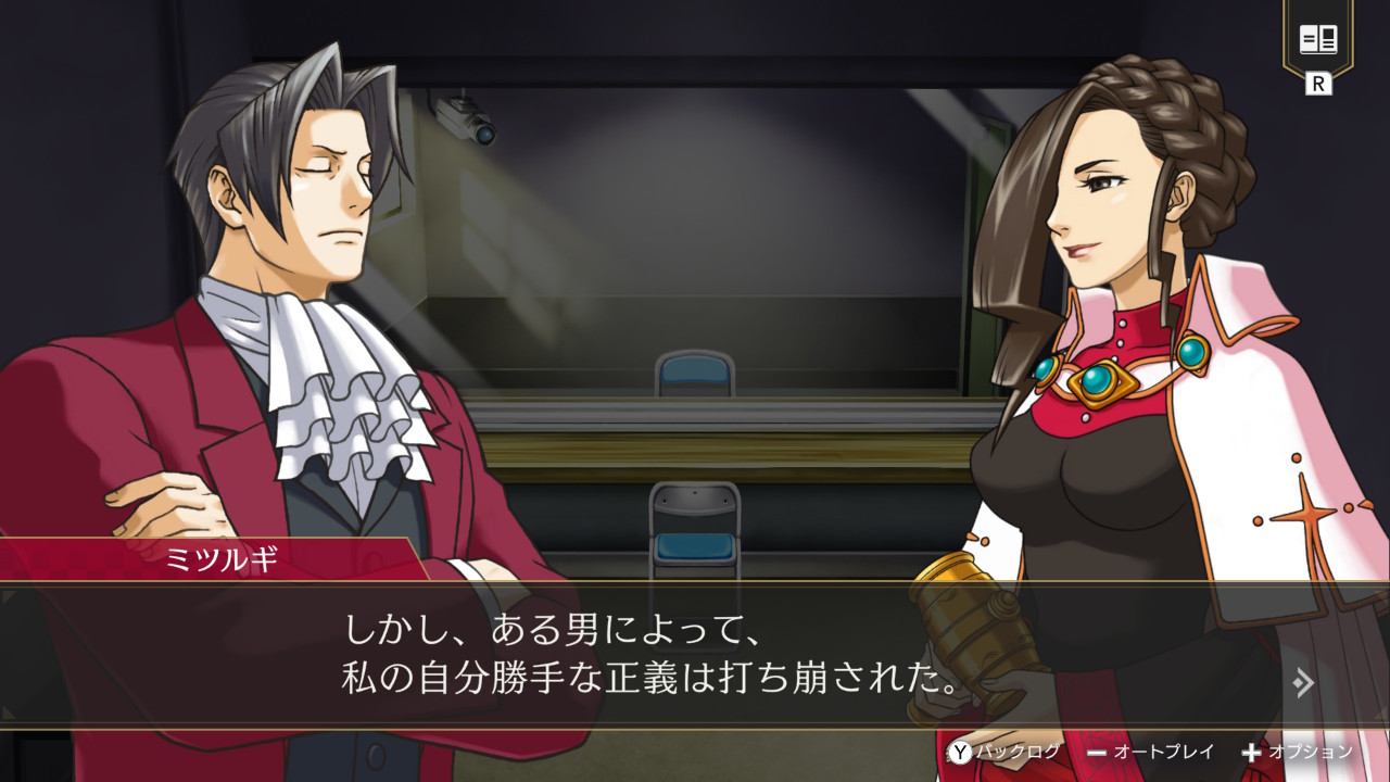 미츠루기 "이곳에서, 저는 한 번《검사 배지》를 반환했습니다. ......예전에, 어느 남자가 말했습니다. 피고인의 유일한 아군이 되어주는 것이 변호사라고. 의뢰인을 신뢰함으로써《진실》에 다가간다... 그 남자의 모습은, 제 눈에도 눈부시게 비쳤습니다. 법정에서 싸우는 아버지와, 마찬가지로..."