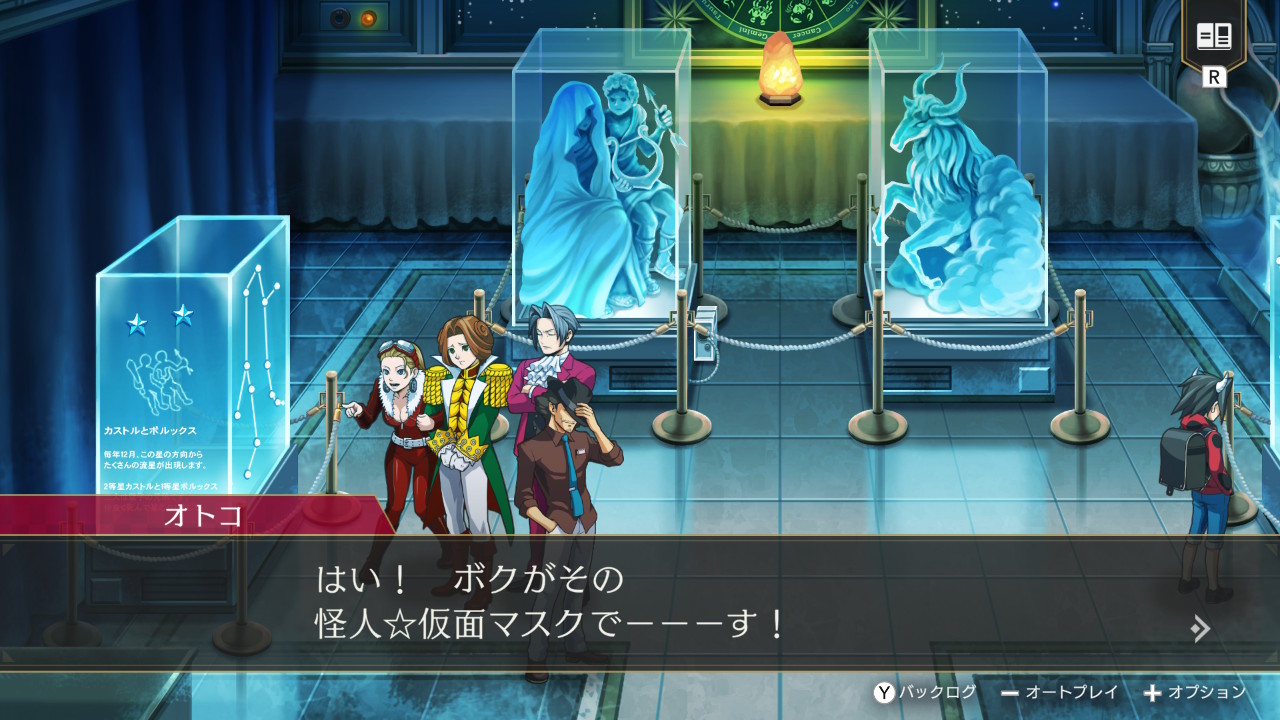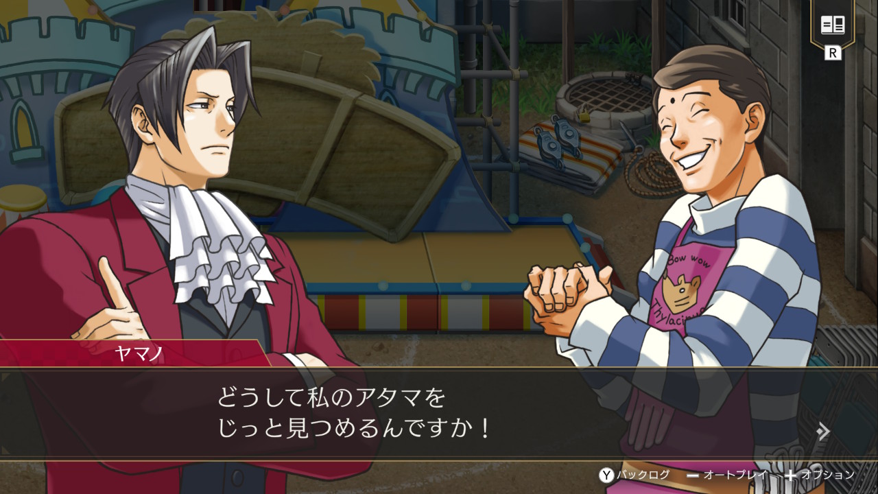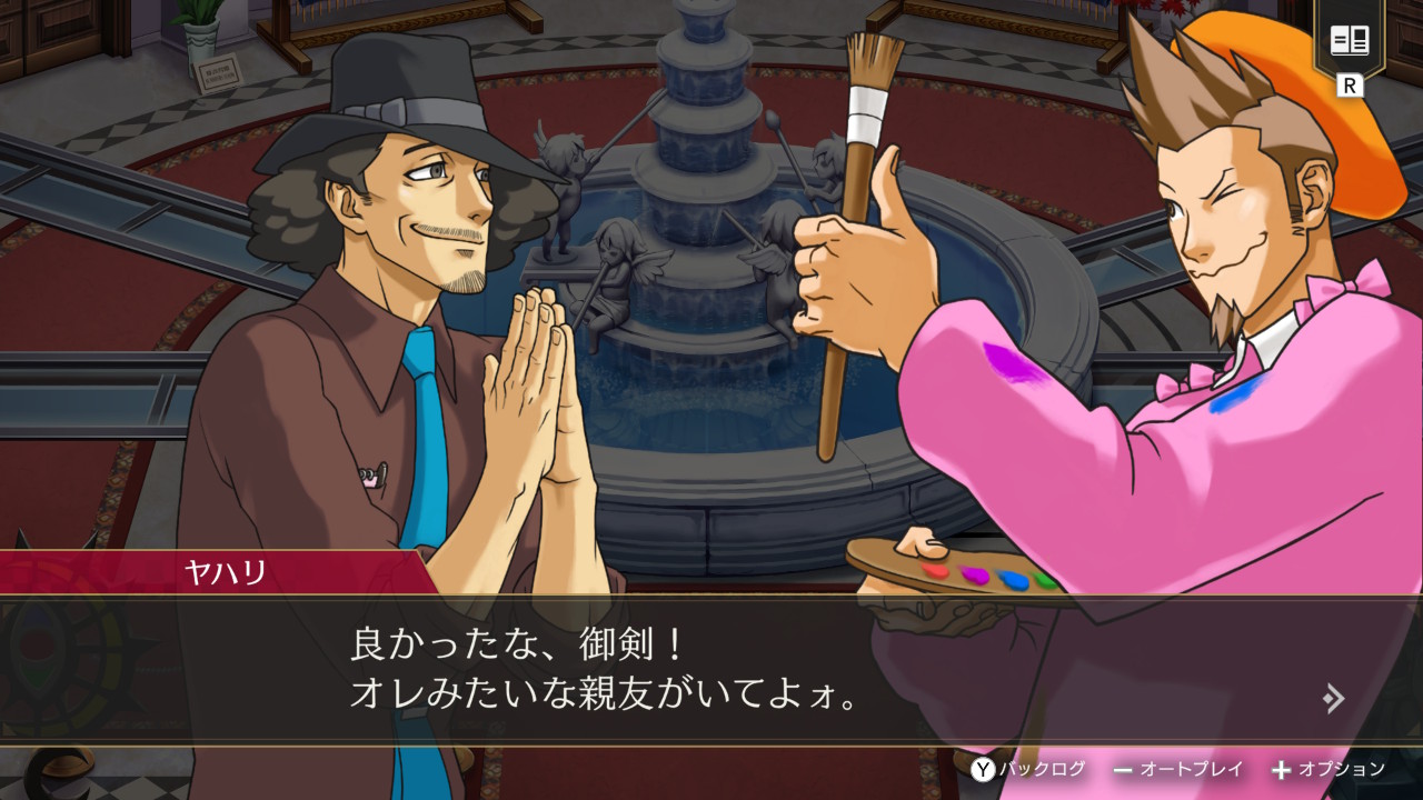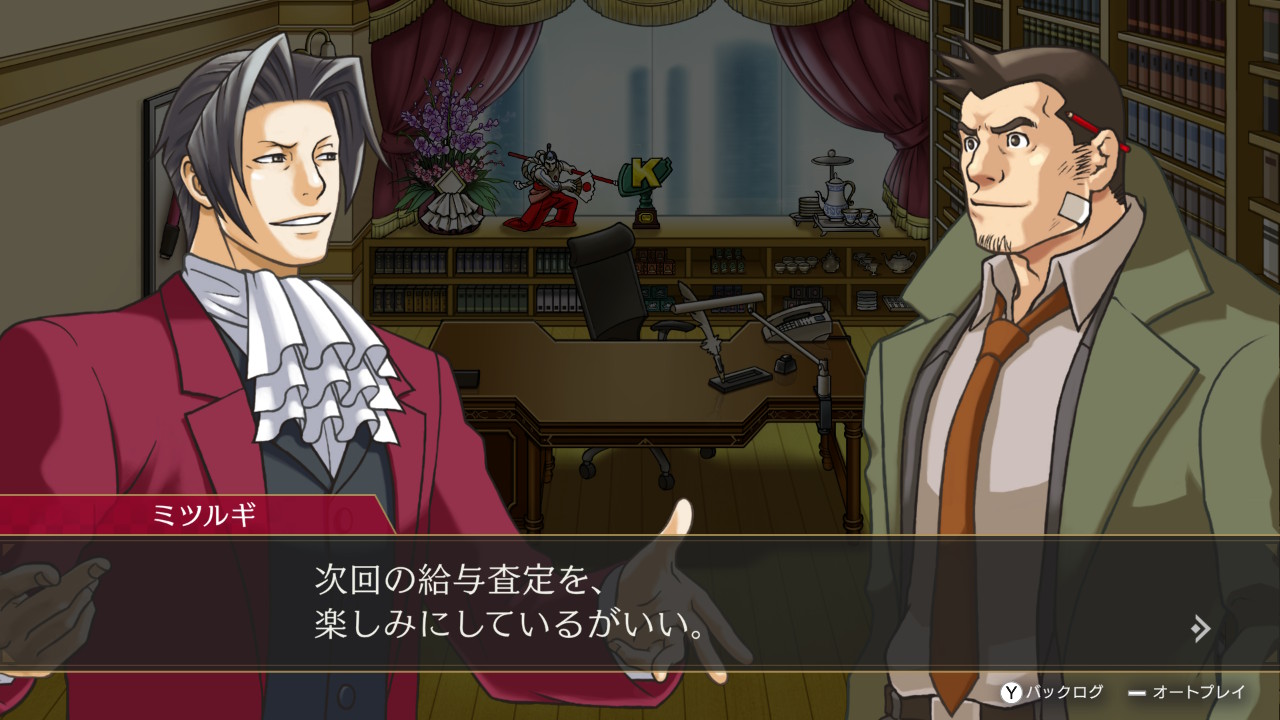 역전검사에서 나왔던 사건의 증거품 이외에도 본편에서 나온 요소가 있어서 찾는 재미가 있었다. 조각상 뒤에 호시카케 사무소에서 타나카가 갈취한 그림도 보이고 체포군 패널이나 스튜디오 길 막던 장식물 머리도 보이고 좌측하단은 코로시야 무전기인가