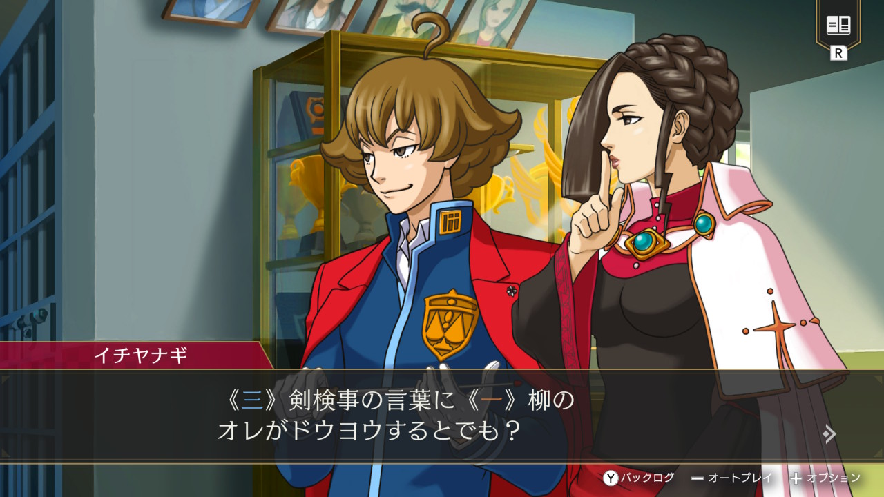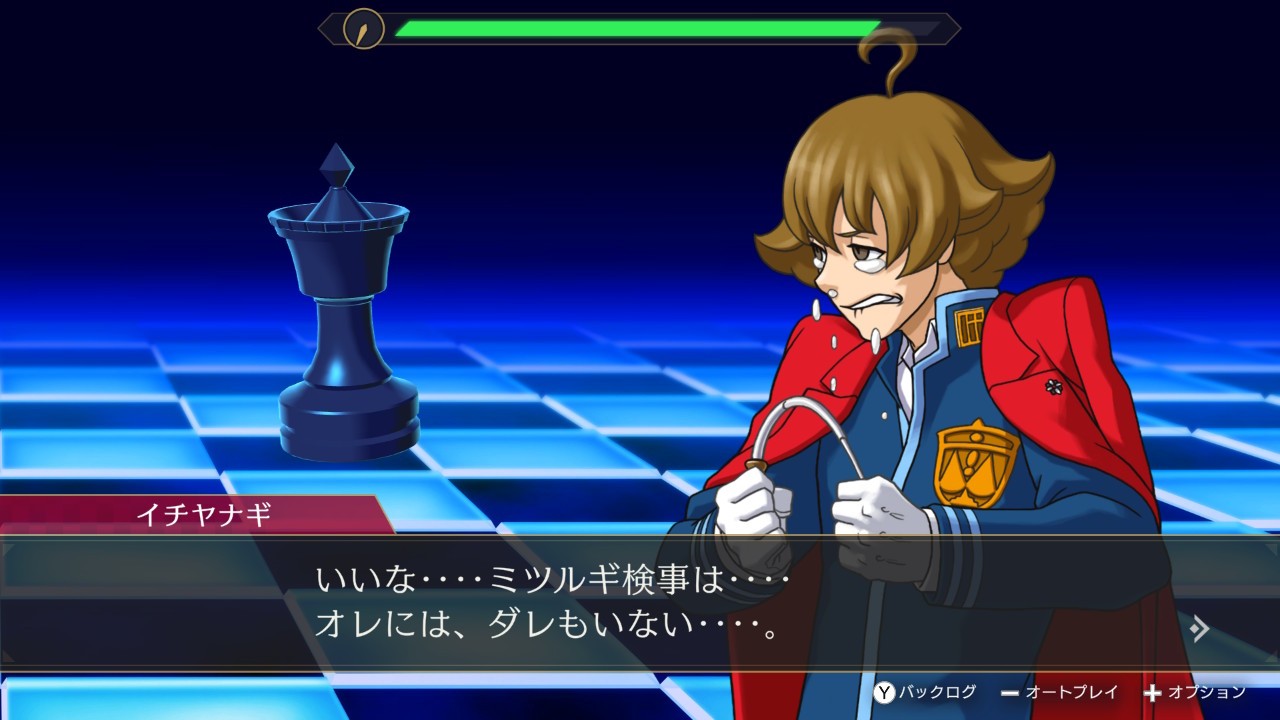 미츠루기 (여기선 억지로라도 이의를 제기해 흐름을 끊을 수밖에 없다...! 하, 하지만, 확실한 건 없다. 그걸로... 정말 괜찮은가? 이런 무모한 방식은 나답지... 아, 아니... 안 돼! 새삼 무엇을 겁낼 필요가 있지! 지금의 나는 검사가 아니다. 의뢰인을 지키는 변호사의 조수다! 나밖에 구할 수 없는 사람이 있다. 그렇다면... 만에 하나의 확률이라고 해도 그것에 걸 가치가 있다!)