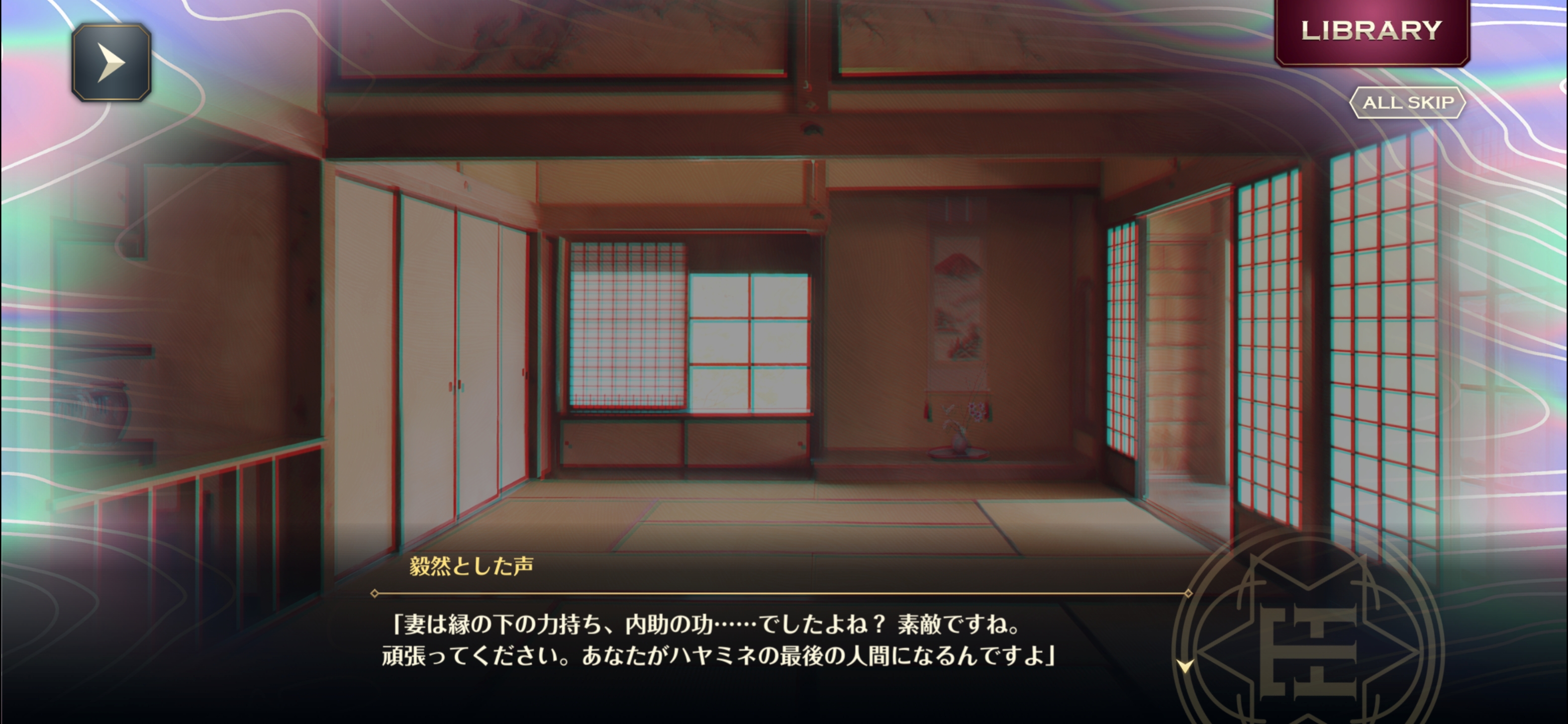 의연한 목소리 "아내는 숨은 조력자(縁の下の力持ち), 내조의 공......이었잖아요? 근사하네요. 열심히 해 주세요. 당신이 하야미네의 최후의 인간이 되는 거예요."